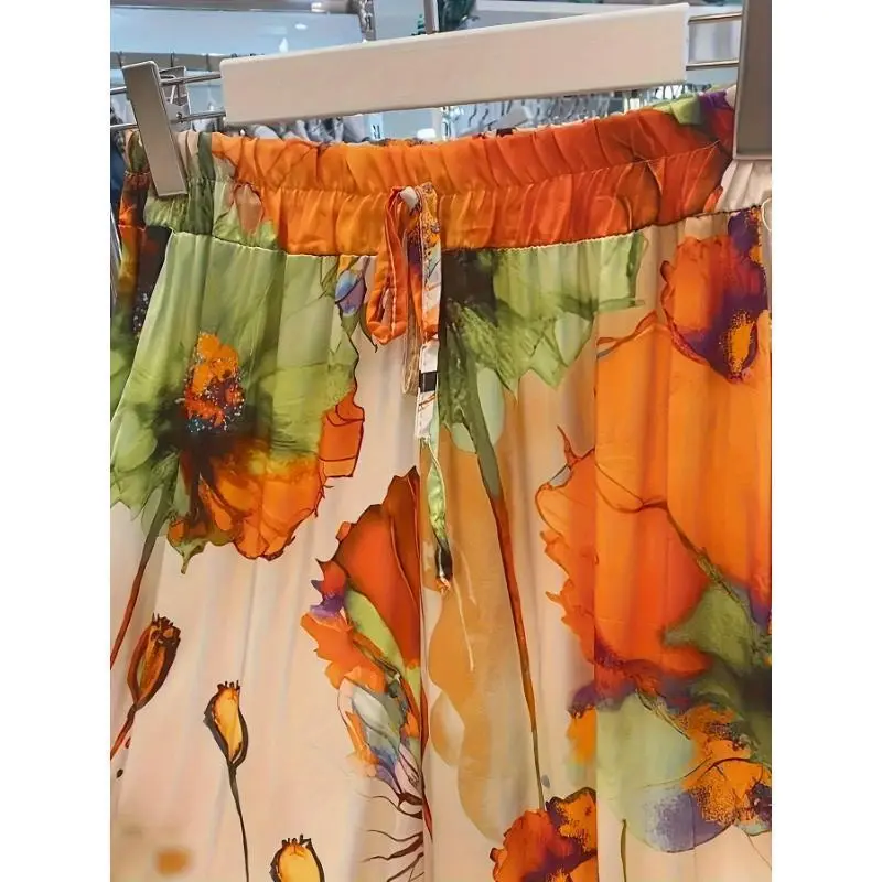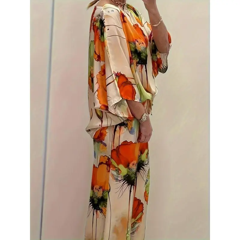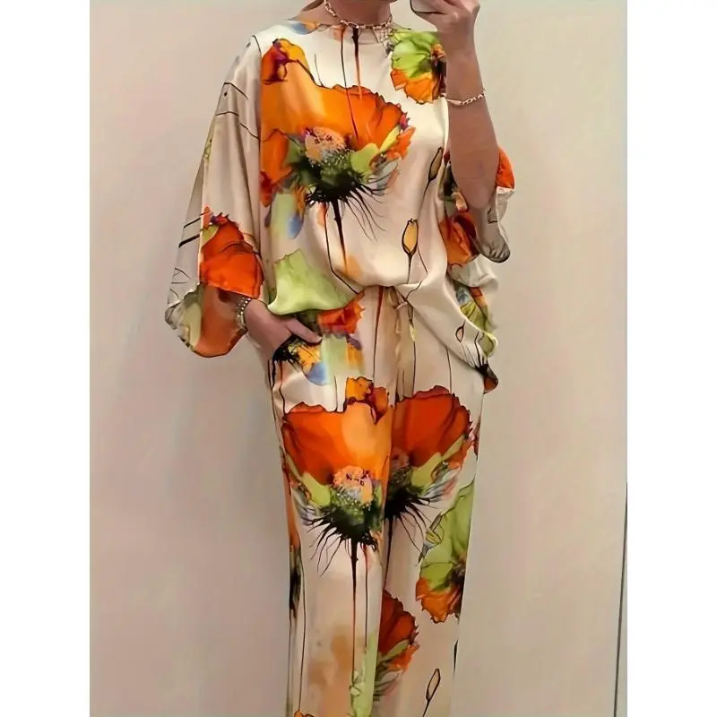 Women'S Elegant Floral Print Satin Two-Piece Set: Round Neck Top and Wide Leg Pants