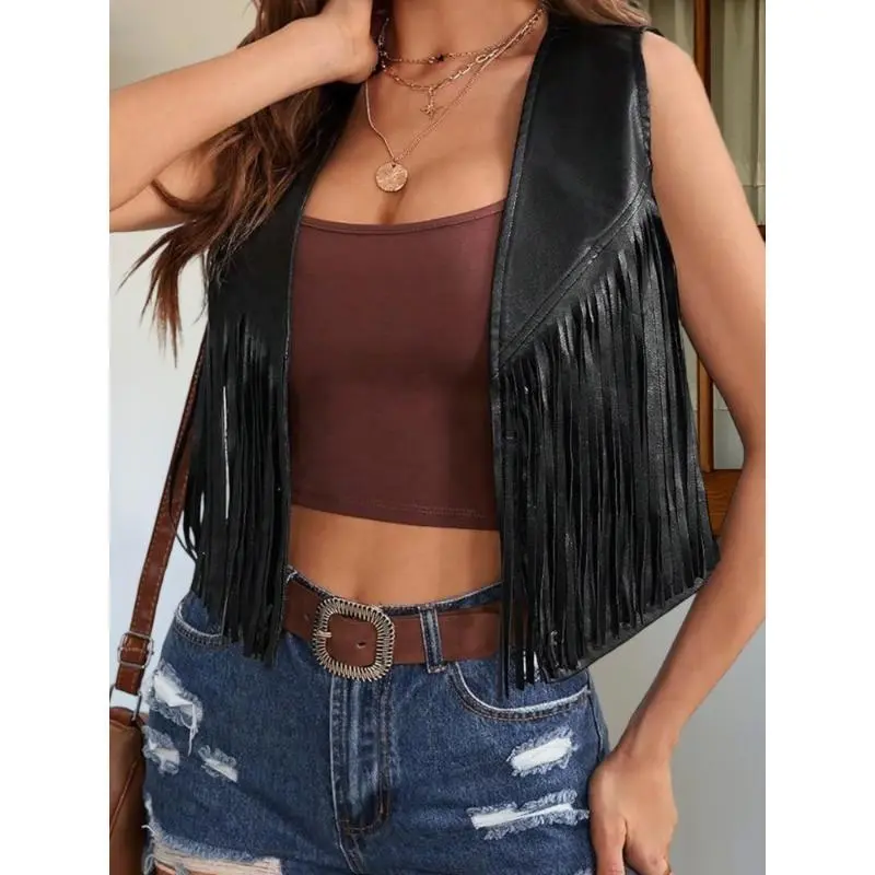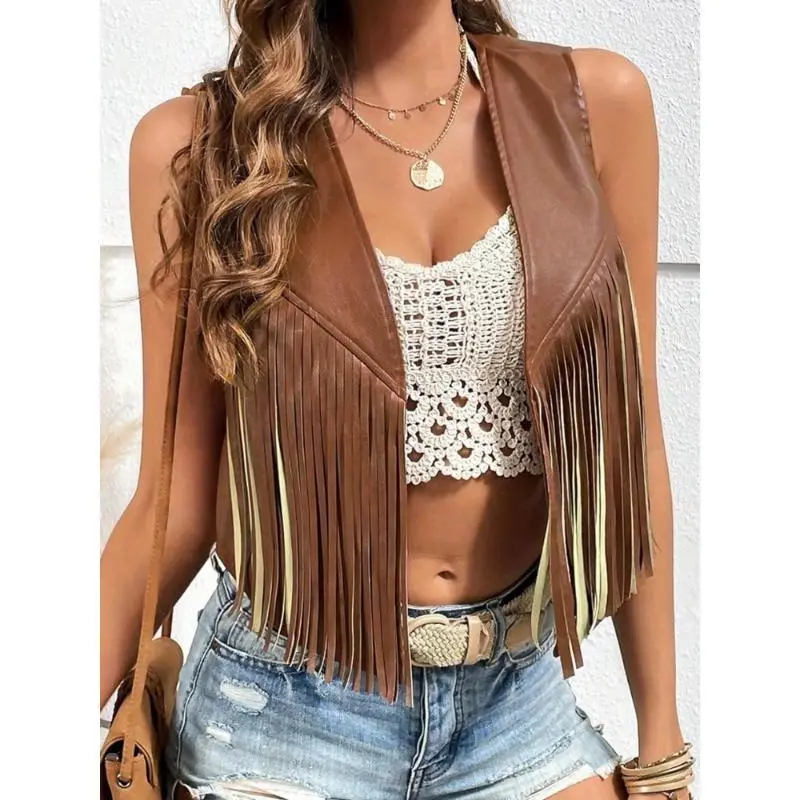 Composition:100% Polyester/Material:PU Leather/Details:Tassel/Pattern:Solid color/Applicable People:Adult/Sheer:No/Type:Coat/Season:Summer/Operation Instruction:Do not wash/Style:Vintage/Fabric Elasticity:No Elasticity/Printing Type:No Printing/Weaving Method:Woven/Collar Style:Crew Neck/Item ID:KG2251137/Origin:Guangdong,China