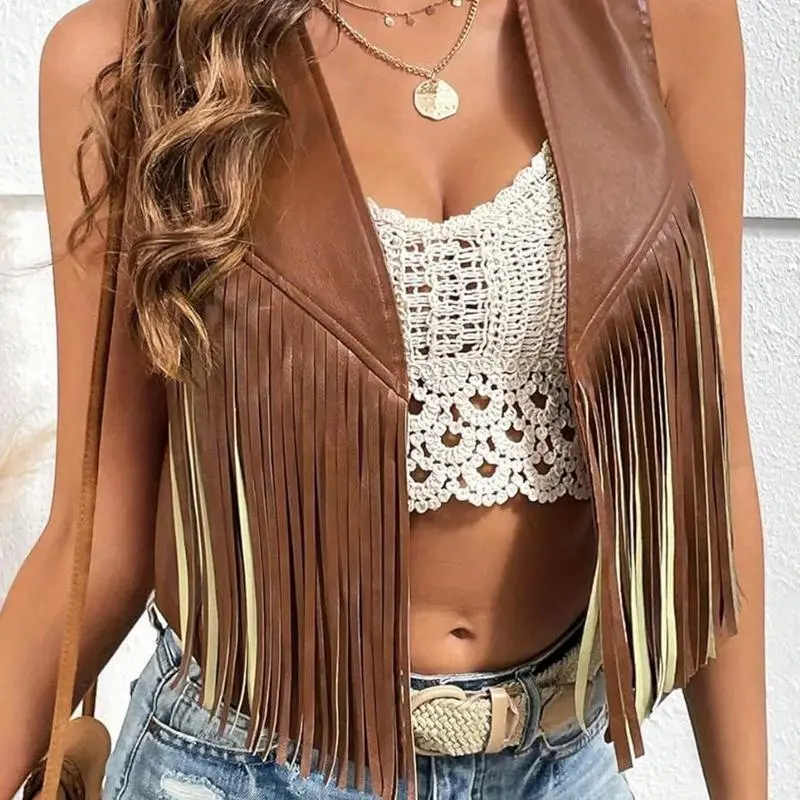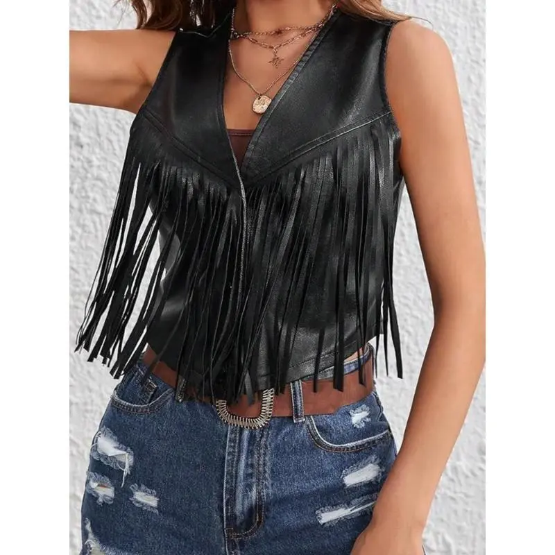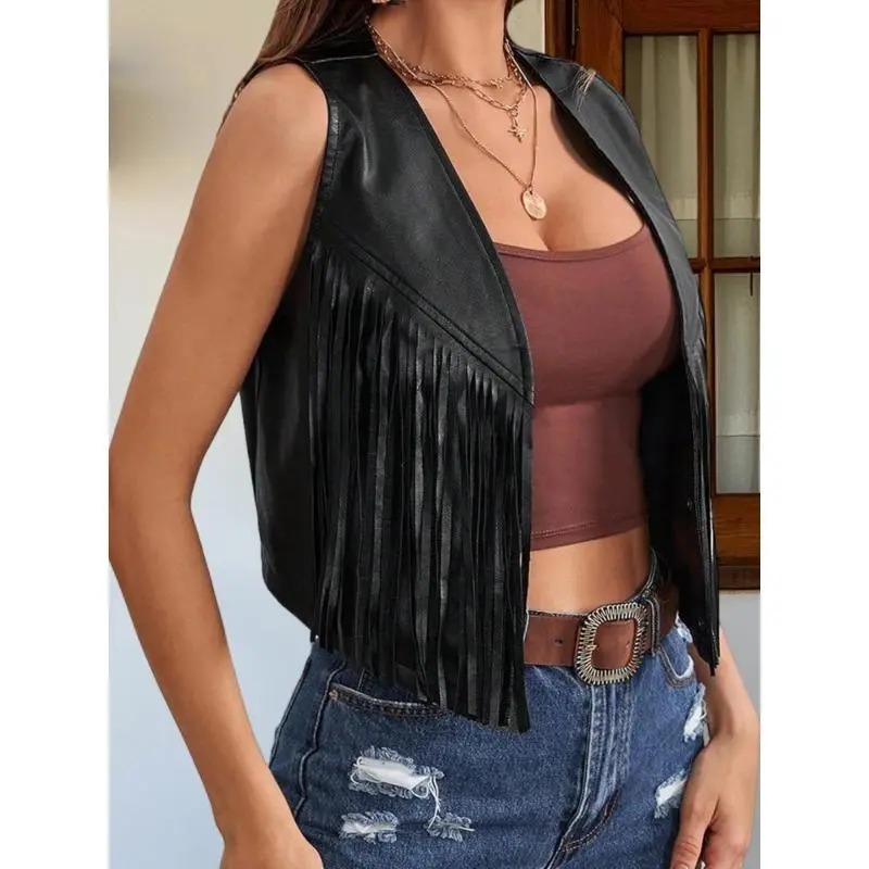 Womens Faux Leather Tassel Vest 70s Hippie Costume Sleeveless Cowgirl Western Outerwear