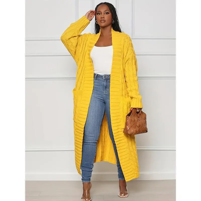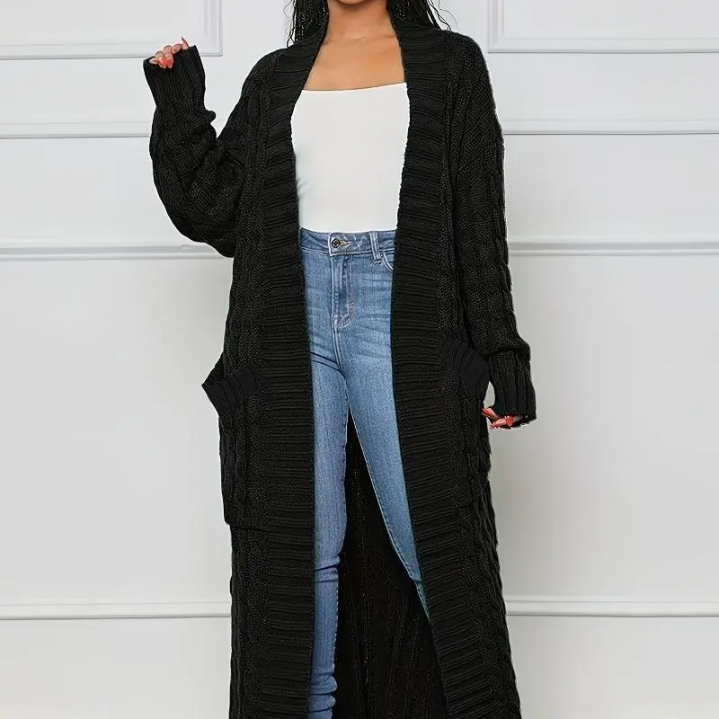 Fashion Women's Clothing Long Length Cable Knit Cardigan - Elegant Solid Long Sleeve Sweater With Pockets - Women's Clothing - Fall/Winter - Suitable Casual & Formal Occasions - Women ? Fabric Fit Knitwear Womenswear Tops Basic