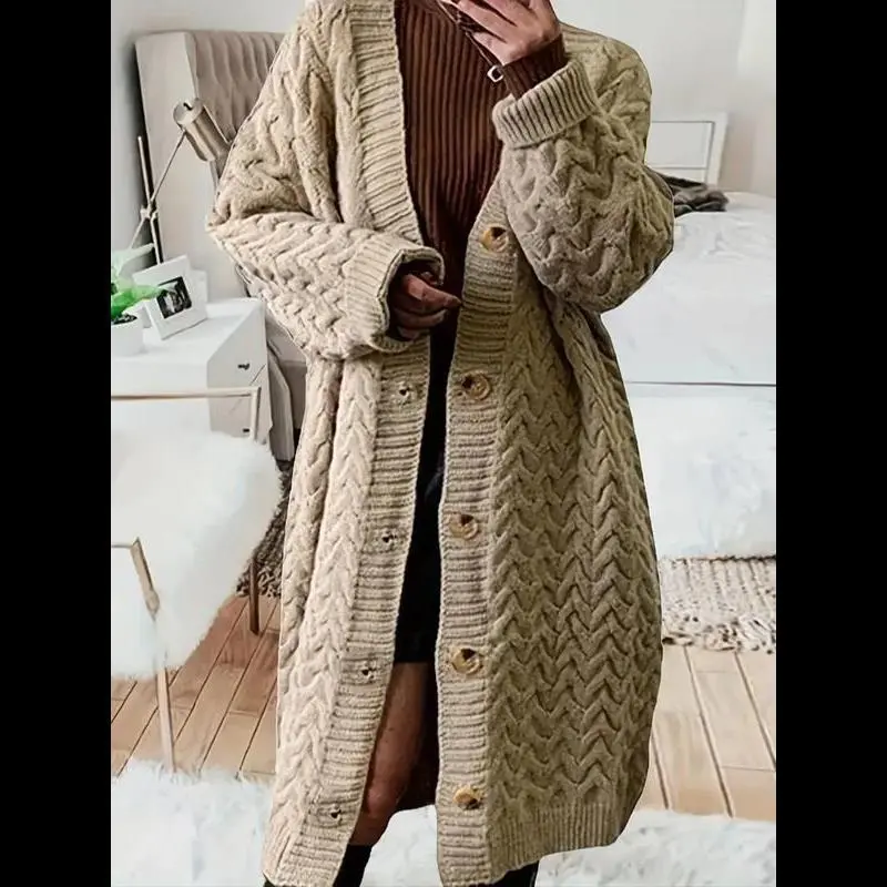 ��Button Closure��: Features a classic button closure for easy wear, adding a secure and structured finish to this cardigan./��Loose Fit��: The loose-fitting design allows for easy layering over other garments, enhancing overall wearability in cooler weather./��Solid Color��: Available in a range of solid colors, this cardigan provides a timeless look that is easy to coordinate with various outfits./��Moderate Thickness��: Crafted from moderately thick fabric, providing suitable warmth for fall and winter seasons without feeling overly bulky./��Knit Fabric��: Made from quality knit fabric, offering durability and a cozy feel while maintaining an approachable texture on the skin.