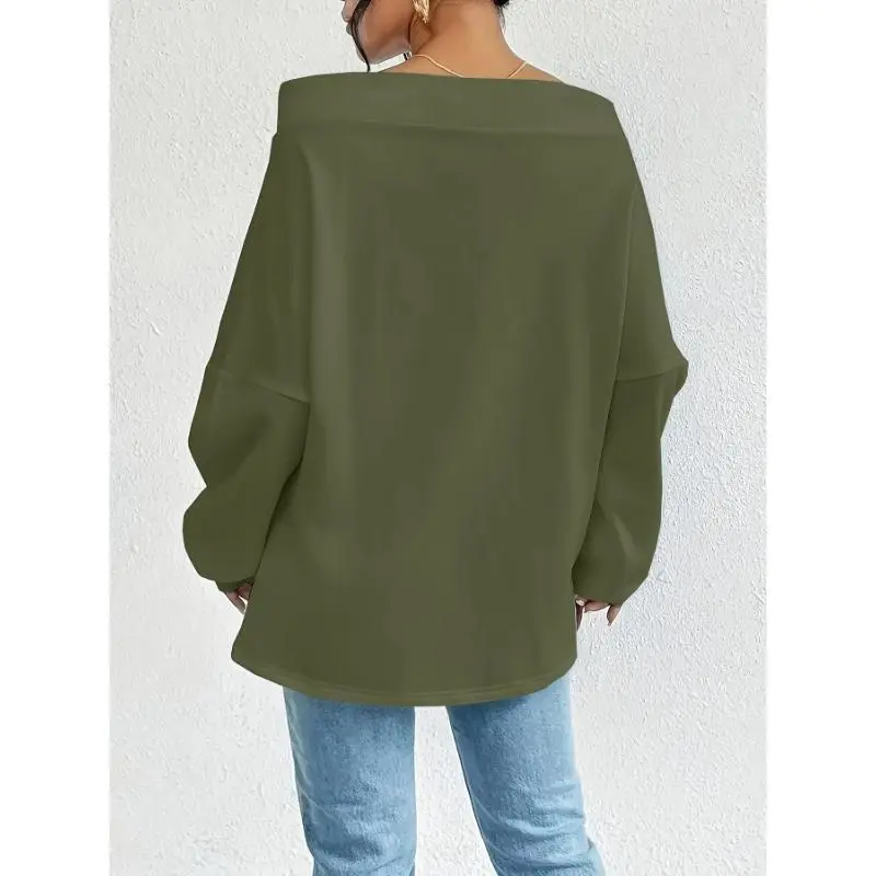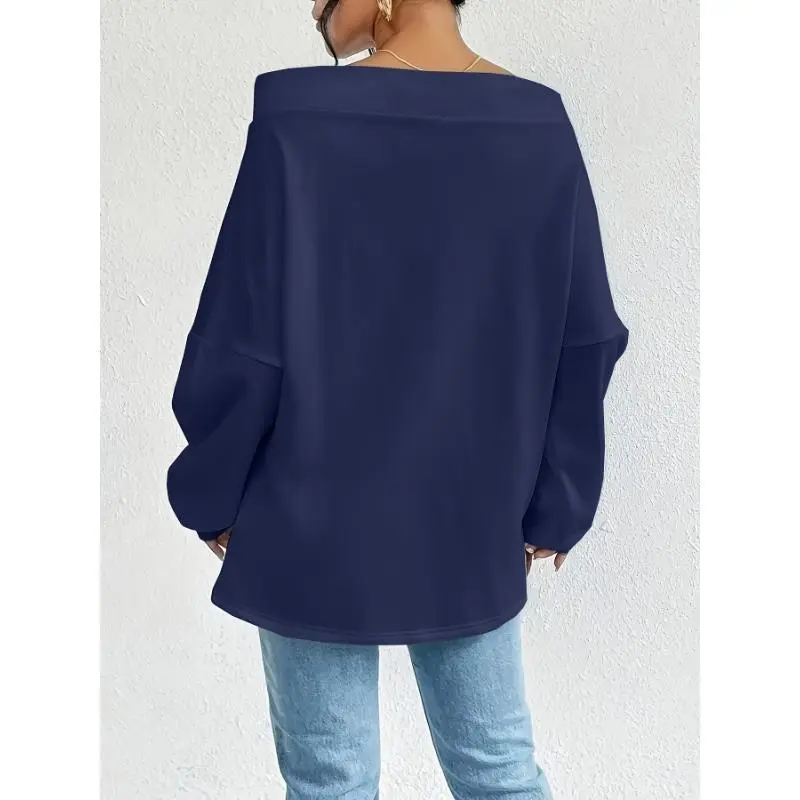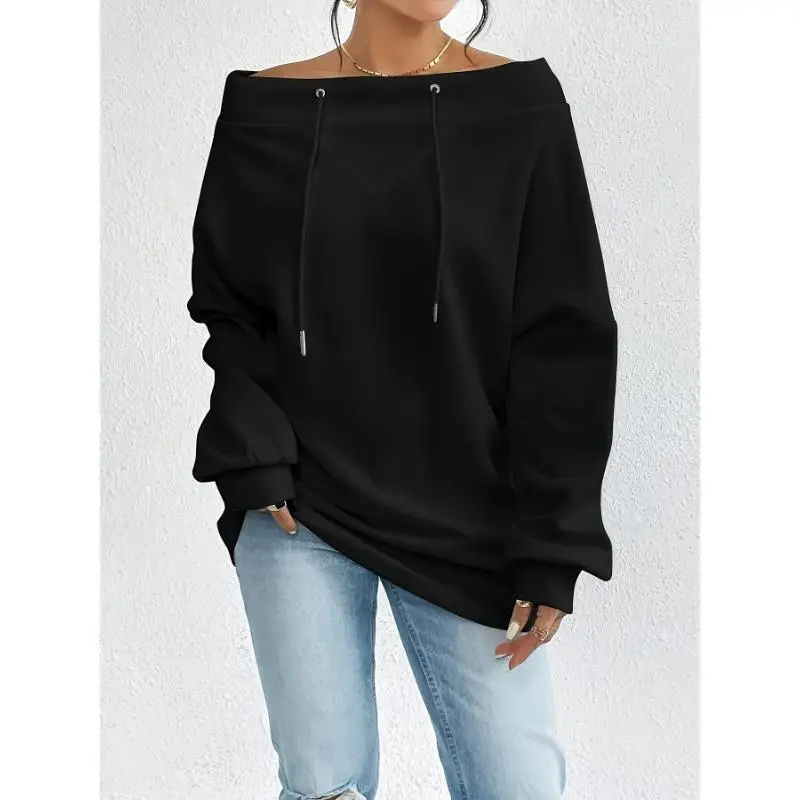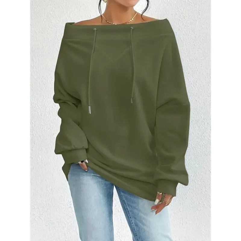 2025 New Women's Casual Off-Shoulder Pullover Sweatshirt Solid Color Polyester Knit Fabric with Slight Elastic Drawstring Detail Loose Fit Suitable for Spring and Autumn Hoodie2025