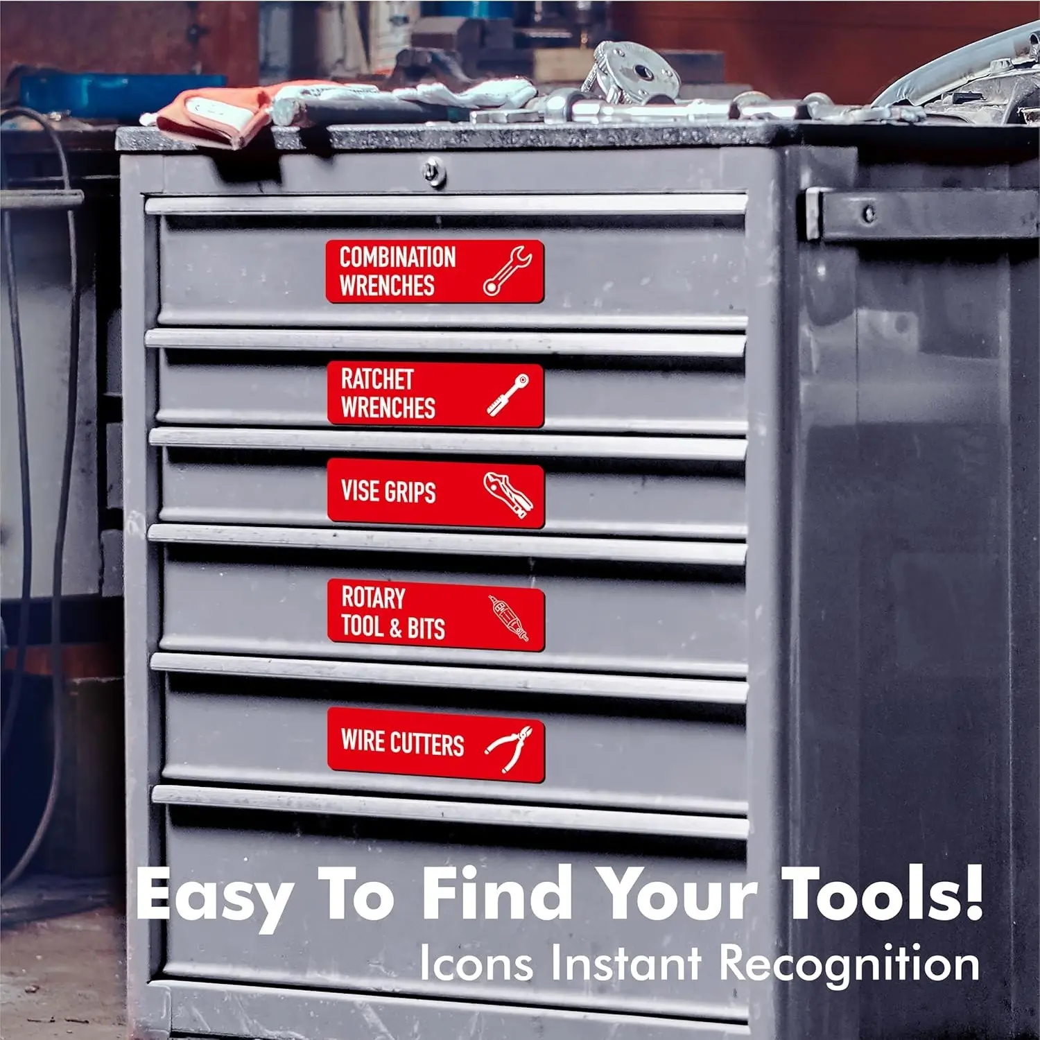·Strong Tool Box Magnets Won’t Fall Off: Unlike adhesive labels, the backside of these magnetic toolbox labels is a super strong magnet that sticks to steel, and won’t shift or fall off when opening and closing tool chest drawers or damage paint