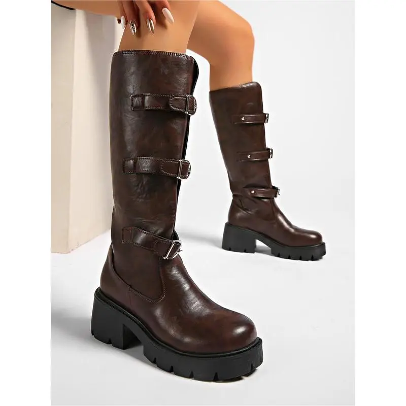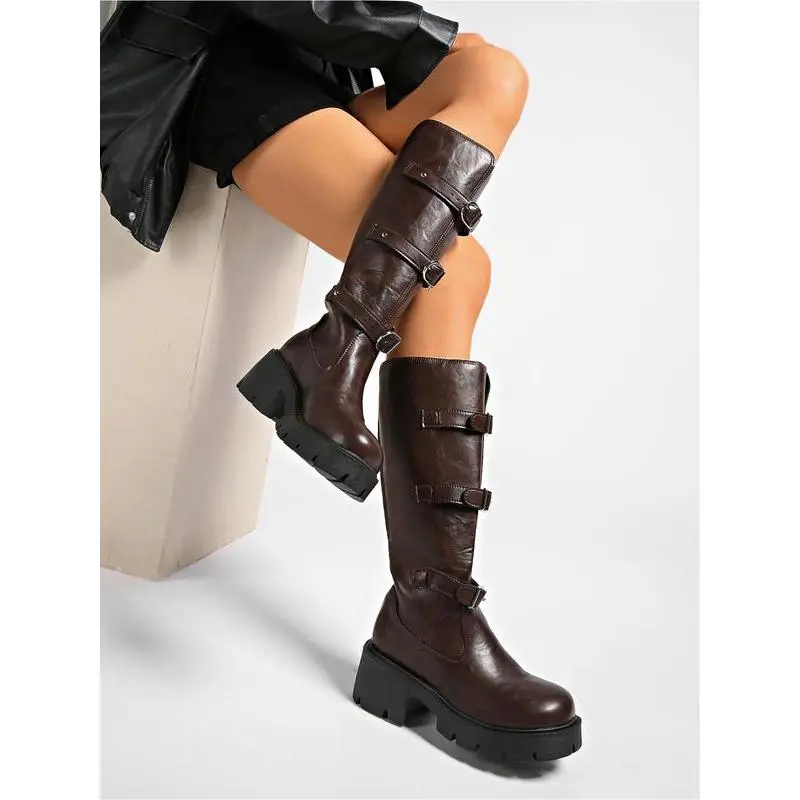 Women's autumn and winter fashion large size mid-calf boots with thick soles and high water platforms, waterproof leather surface with metal buckle decoration, leather boots with soft soles, anti-slip and wear-resistant, high-quality commuting boots.