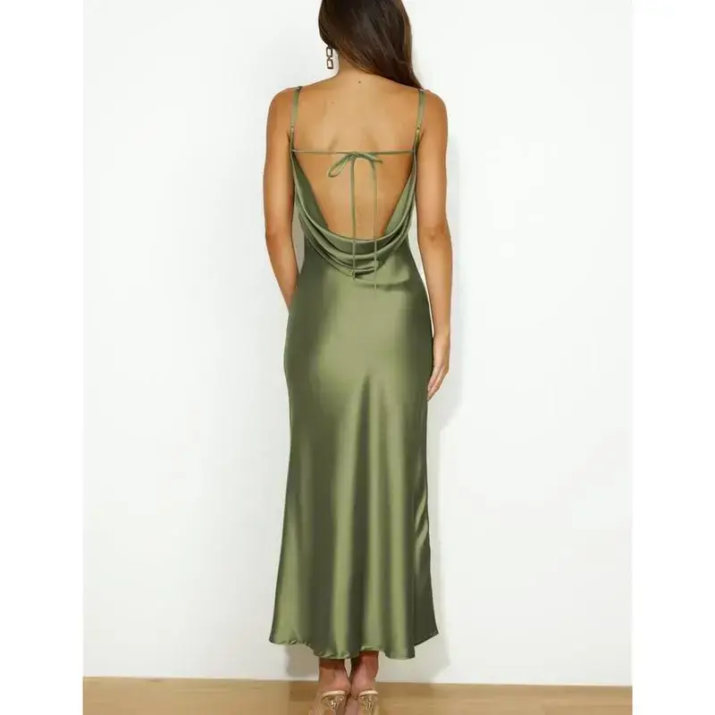 🎉 Elegant Summer Satin Dress 🎉/✨ Design Highlights: This dress features a cowl neck and spaghetti straps, perfect for summer events. The ruched design adds a touch of sophistication. Ideal for cocktail parties or formal gatherings, it offers a versatile look. The backless style ensures a chic, elegant appearance. Tie the back for a personalized fit./✨ Versatility: Suitable for both summer and winter formal occasions, this dress adapts to various settings. Its satin material provides a smooth, flowing feel. Pair it with your favorite accessories to complete the ensemble. A timeless piece for any fashion-forward woman./✨ Key Features: - Cowl neck design - Spaghetti straps - Ruched detailing - Backless with tie feature - Perfect for cocktail and formal events/Elevate your wardrobe with this versatile satin dress!