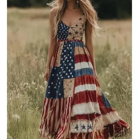 Women's Vintage Independence Day Patch Art Line Dress American Flag Floral Print Dresses Casual Polyester