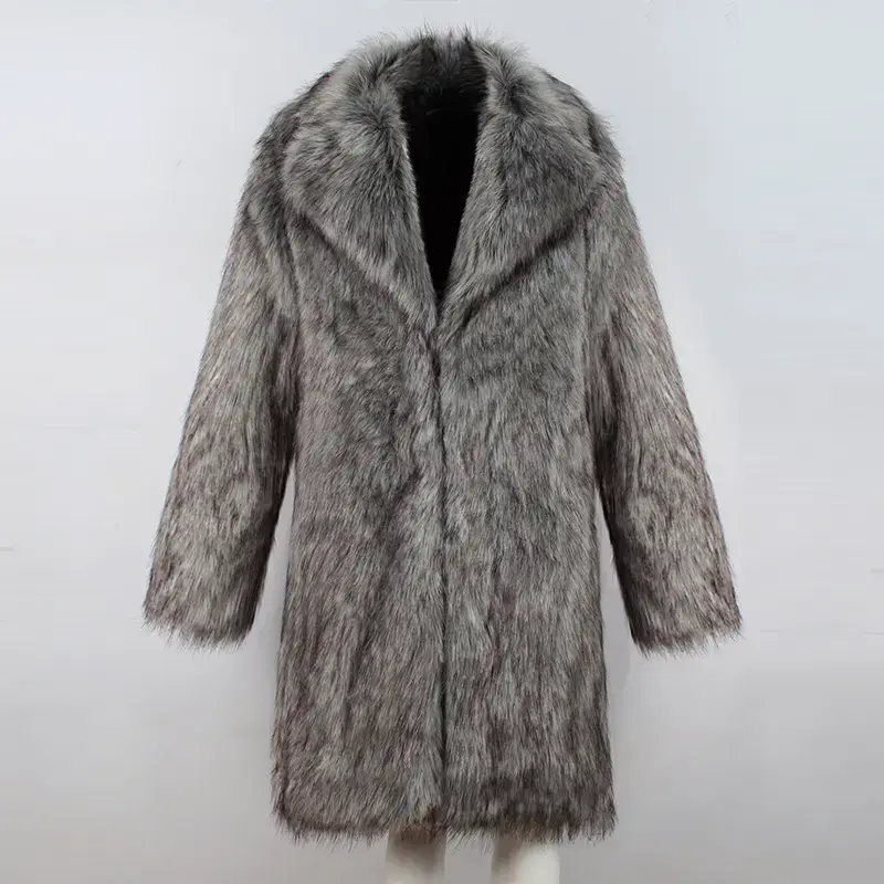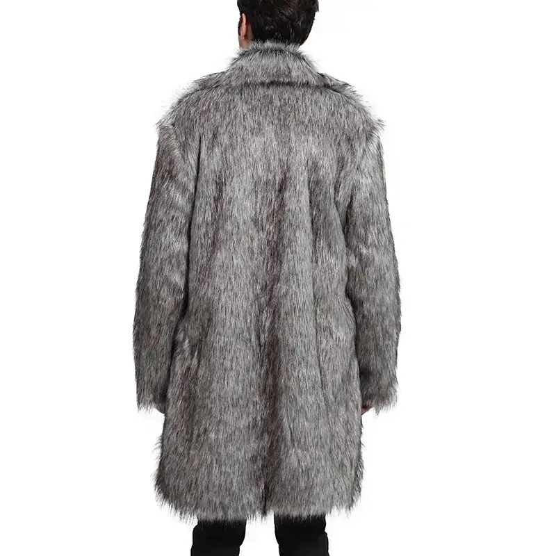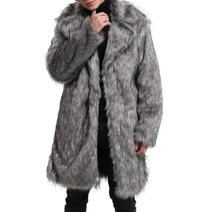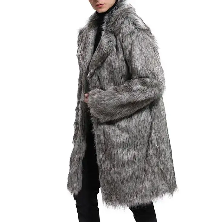 2025 Autumn Winter Fur Coat Men's Mid-Length Faux Fur Warm Fur Coat Beige Gray Bottom Black Tip Menswear Long Sleeve Plain Jackets