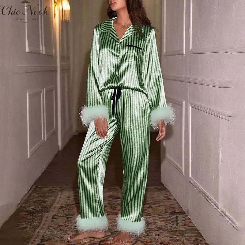 Women's Striped Satin Pajama Set Long Sleeve Button Down Pants Pjs 2 Piece Sleepwear