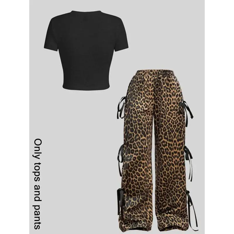 ??Dynamic Print??: Featuring a unique star and leopard print pattern, this set stands out with its lively and bold visual appeal. ??Short Sleeve Top??: The short sleeve T-shirt provides a lightweight option for warm weather, ensuring breathability and ease of movement. ??Leopard Pants??: The leopard print long pants with tie details create an edgy look, integrating fashion-forward elements into everyday wear. ??Fitted Silhouette??: Designed with a fitted cut, this outfit enhances the body's natural shape, offering a flattering look for various occasions. ??All Seasons Wear??: Suitable for all seasons, this ensemble can be easily layered, making it adaptable to changing weather conditions.