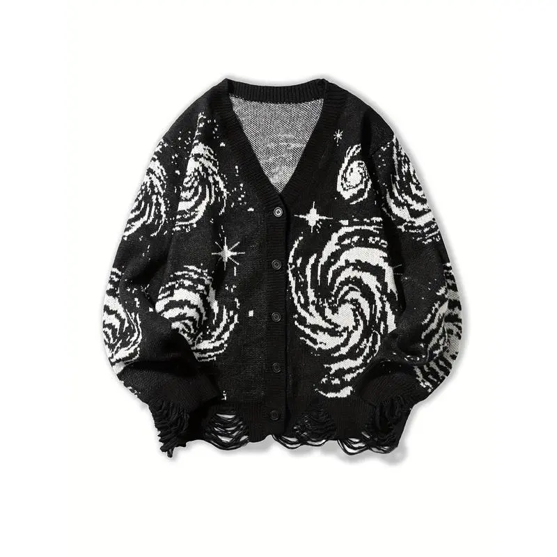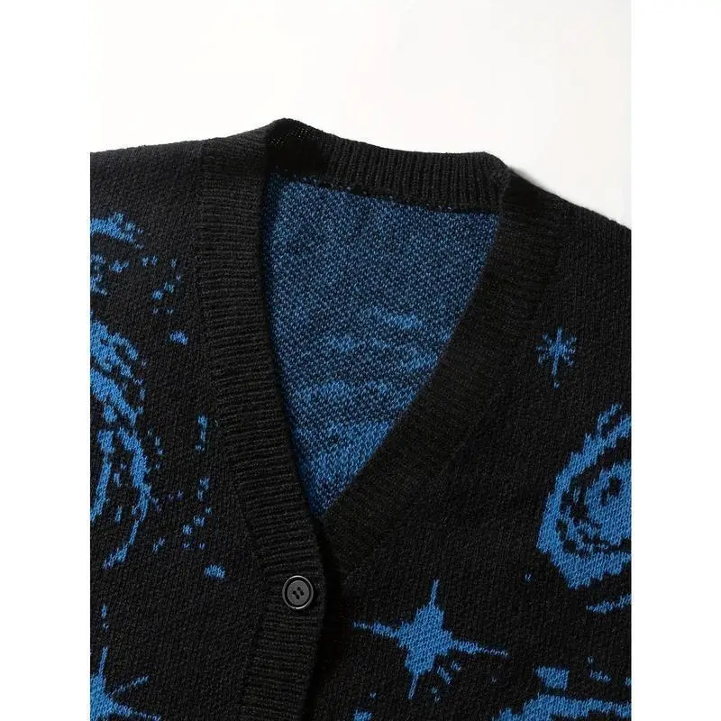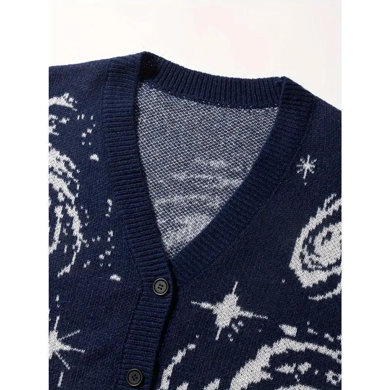 Men's Oversized Starry Sky Knit Cardigan Sweater - Black & White Galaxy Print, Button-Up Front, Loose Fit, Warm & Comfortable for Fall/Winter Casual Wear, Knit Sweater