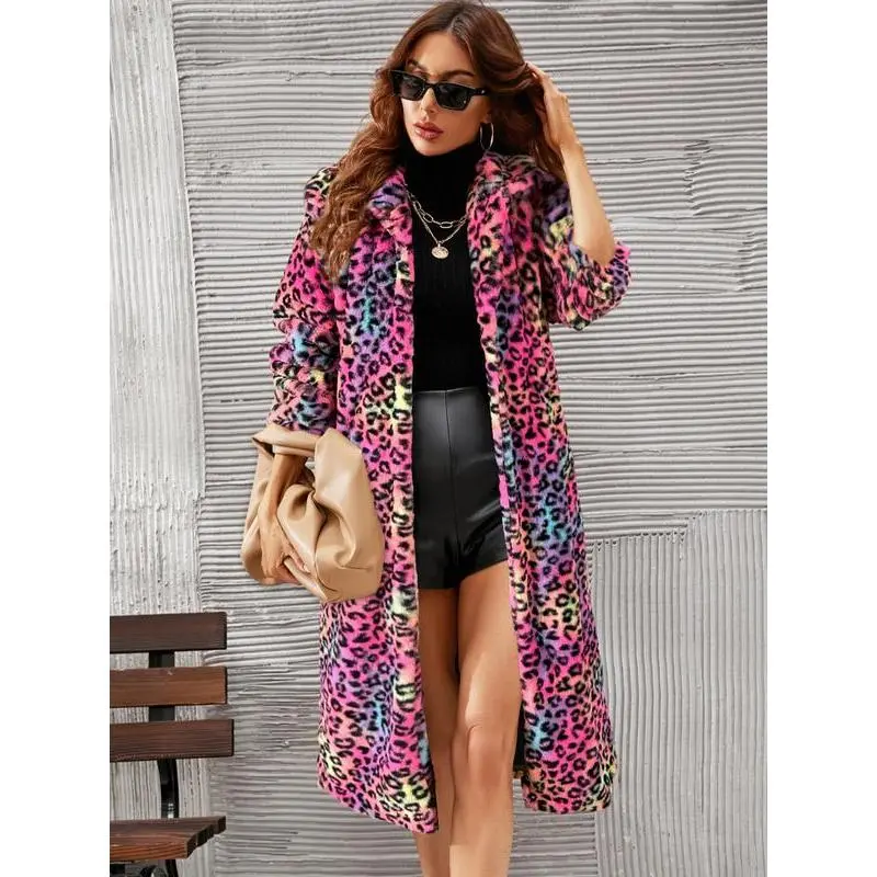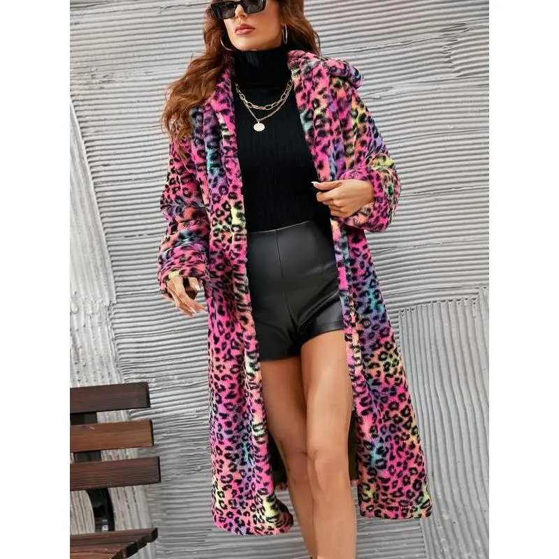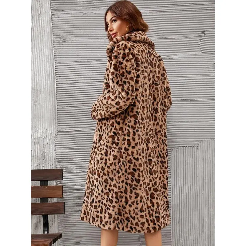 Women's Leopard Print Faux Fur Coat, Long Fashionable Winter Jacket, Plush Collar Design, Stylish Outerwear for Autumn & Winter Seasons Can be used with raincoat