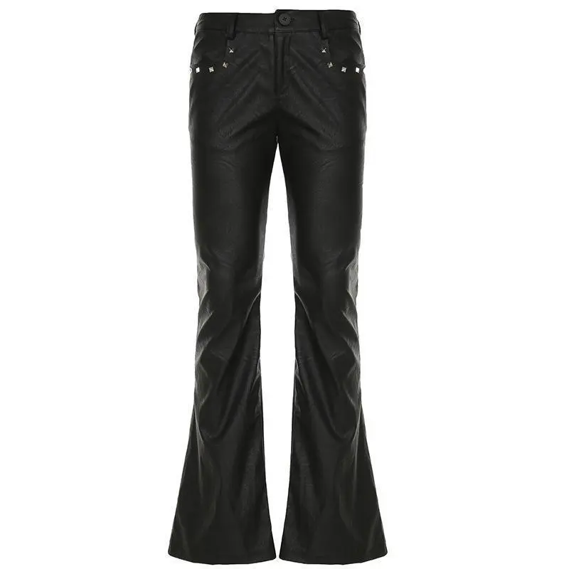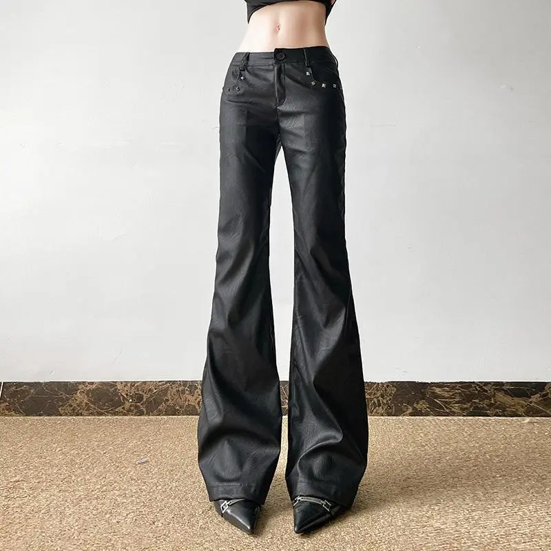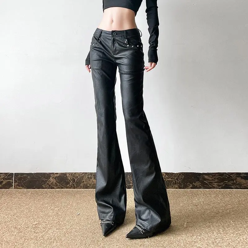 Lianlian Bu Wang Street Style Cool and Handsome Hot Girl Rivet Low Waist Leather Pants Dark Rock Slim Straight Long Pants
