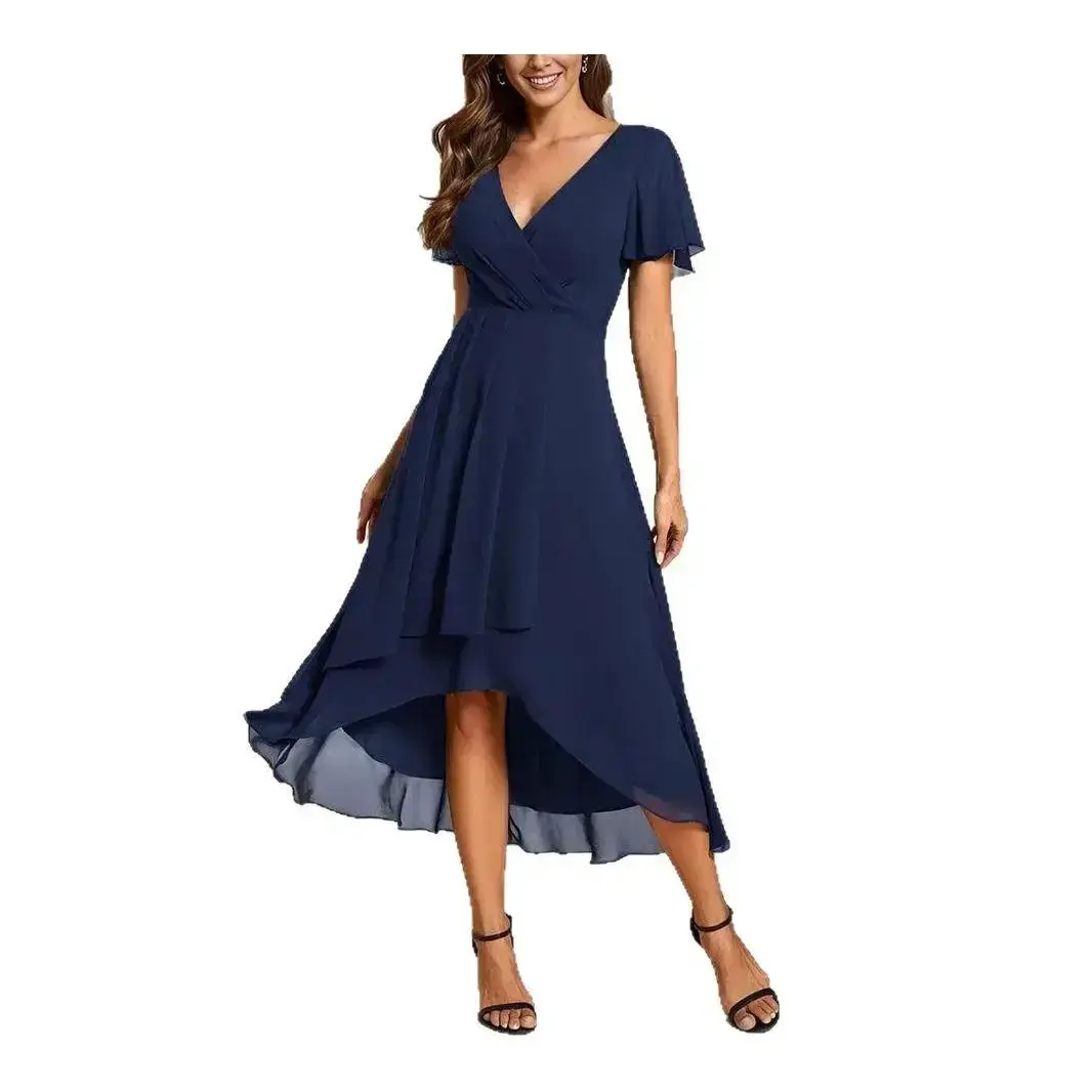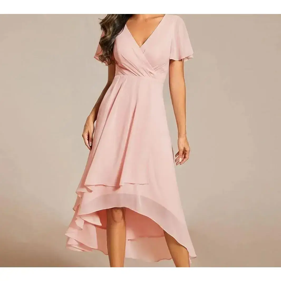 Women's Chiffon and Polyester Short-Sleeve A-Line Mid-Length High-Low Hem Dress with Lotus Leaf Flutter Sleeves and Surplice V-Neck for Wedding Guest Cocktail Party Thanksgiving Outfits