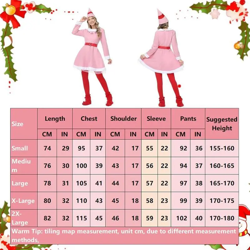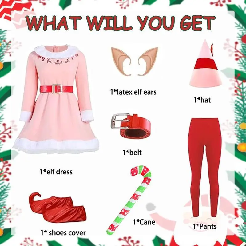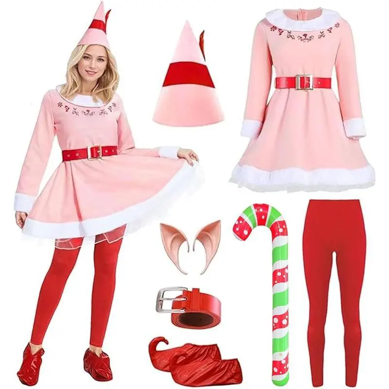 Elf Costume: This pink Elf dress features a soft and sweet pink as its main color, complemented by classic red and white contrasting details (white plush edges on the collar, cuffs, and hem, and a red belt), perfectly matching the theme of the Christmas season.It will instantly make you the focus of attention at holiday parties and family gatherings, easily creating a warm and joyful festive atmosphere. Package includes: The set contains a pink dress, an elf pointed hat, a red belt, red skinny pants, elf ears, red shoe covers, and an inflatable candy cane prop.There's no need for additional matching, and you can quickly create a complete elf look, saving both time and effort. Comfortable material, skin-friendly and easy to wear: Made of high-quality suede fabric, it has a soft and skin-friendly touch, and is comfortable and breathable to wear.The dress has a loose yet well-fitting fit, allowing for no restrictions on movement.Even after wearing it for a long time, there won't be a stuffy feeling. Exquisite details: The neckline features delicate Christmas element embroidery, the belt is equipped with a metallic texture buckle, and the shoe covers and hat designs restore the essence of the elf character.Every detail showcases quality, making your elf outfit more textured. It is not only suitable for Christmas festival celebrations, but also can be used in various scenarios such as Halloween cosplay, theme parties, and stage performances. From adult parties to family parent-child interactions, it can showcase the unique charm of elves, adding fun and surprises to every appearance of yours.