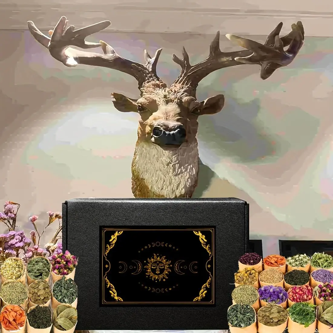 Kit Contents: 40 packs dried herbs/spices, 1 random natural crystal stone, 1 vintage carved metal spoon, 1 sun/moon phase gift box