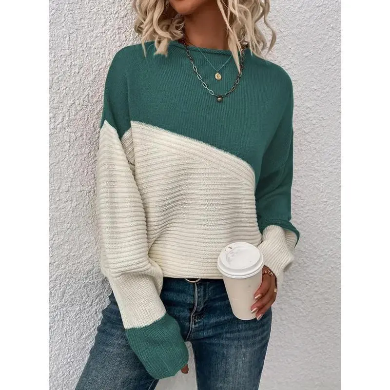 Women's Colorblock Drop Shoulder Sweater, Casual Long Sleeve Round Neck Jumper, Ladies' Knitwear for Daily Wear, Sweaters for Women, Tops, Womenswear