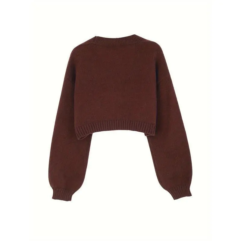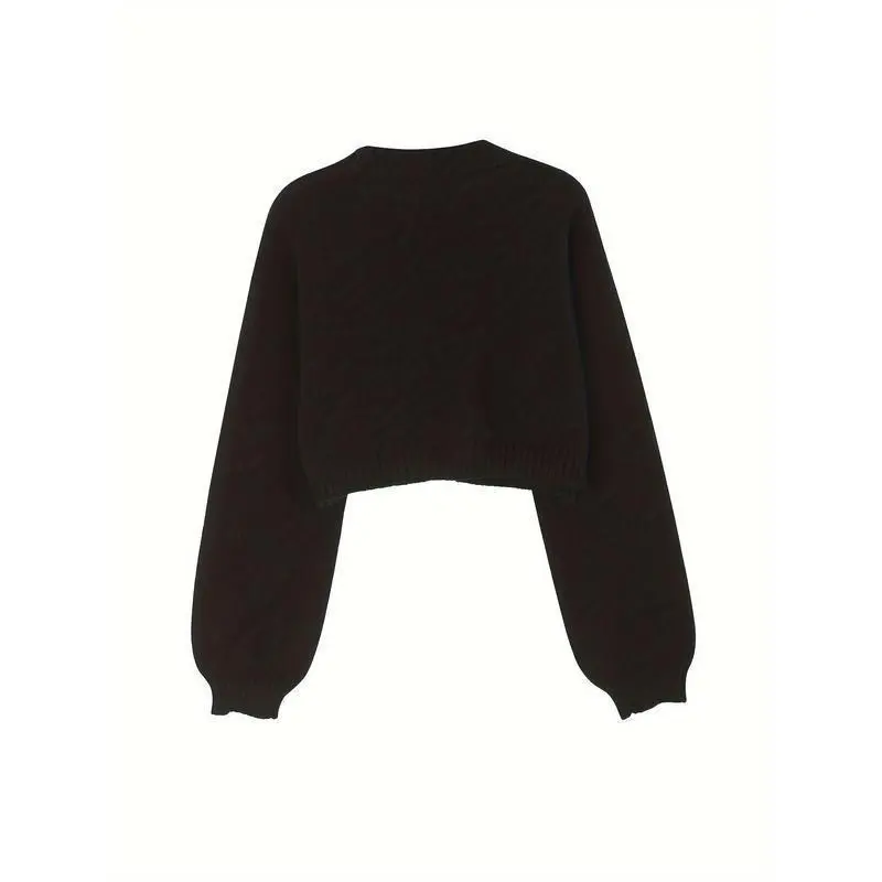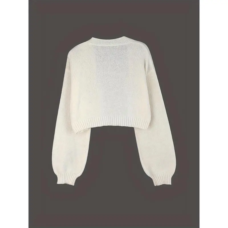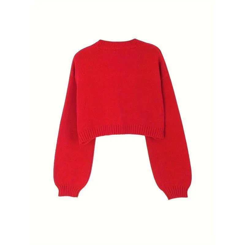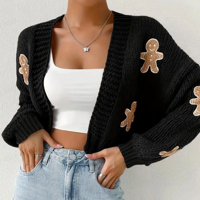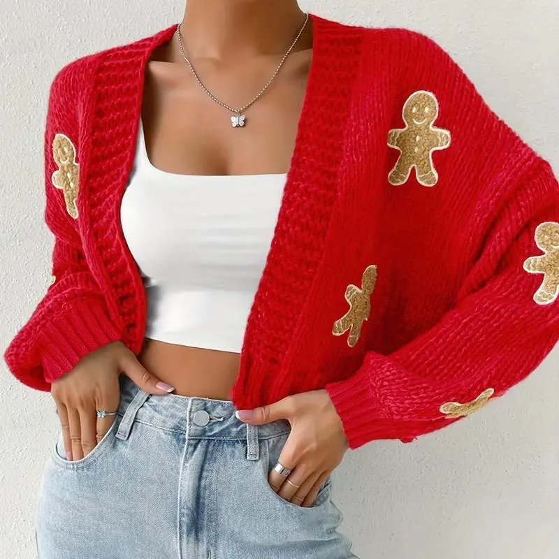 Gingerbread Man Crop Cardigan - Women's Autumn/Winter Long Sleeve with Christmas Embroidery Sweater Knitwear Casual Tops Vneck fall sweater