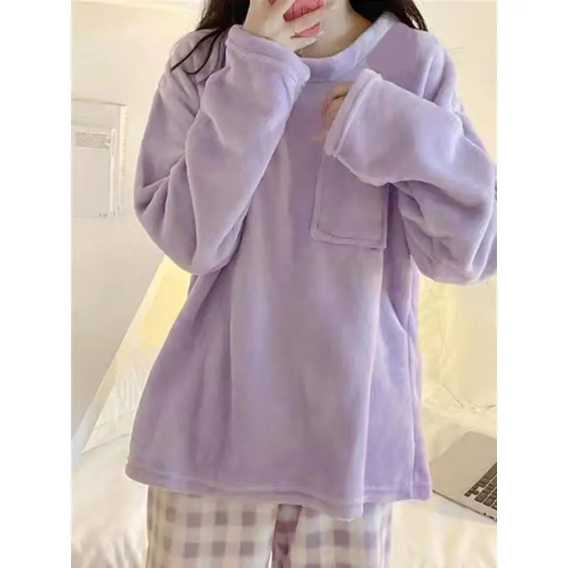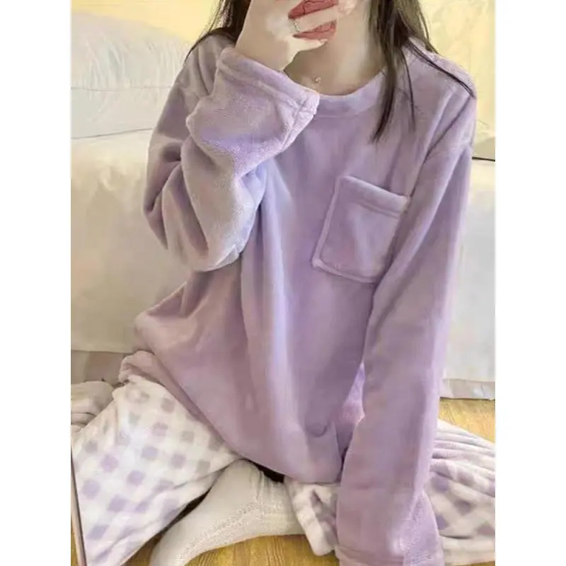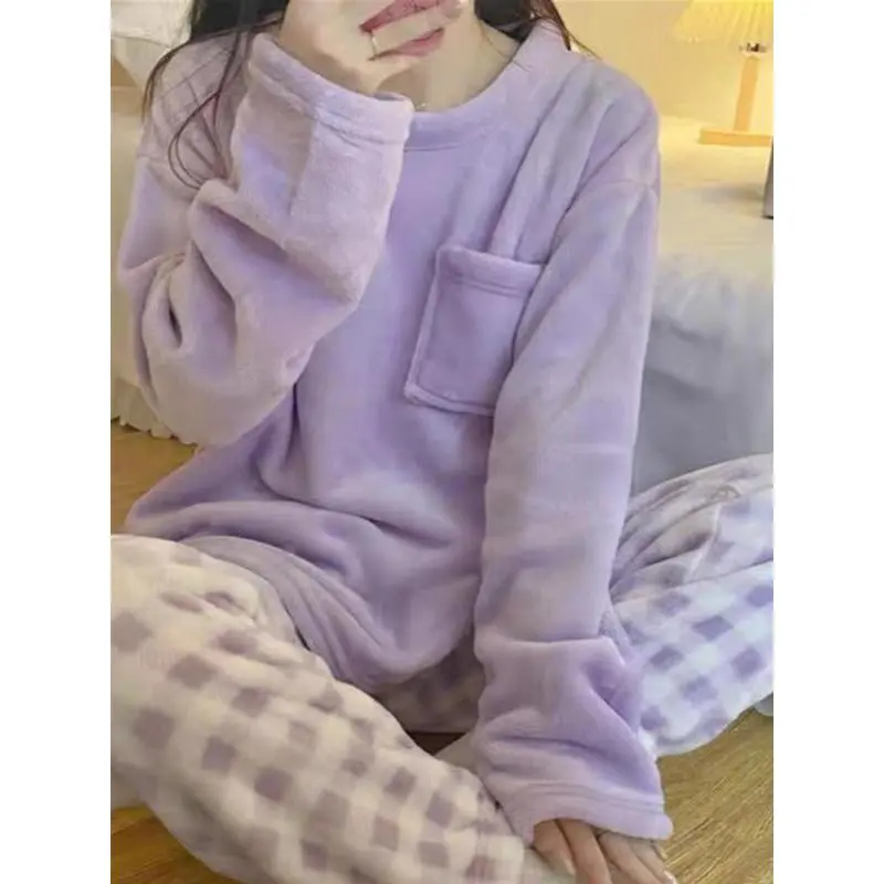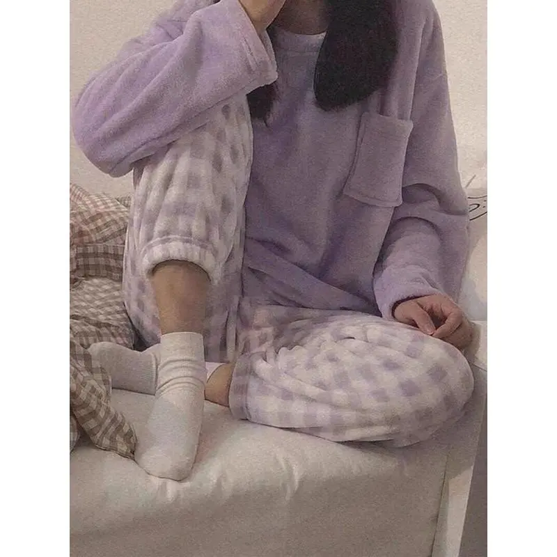Women's Plaid Print Flannel Pajamas Set, Casual Thermal Pocket Top & Plaid Print Pants, Comfy Warmer?PJ?Sets for Fall & Winter, Lounge Co-ord Set Can be used with raincoat