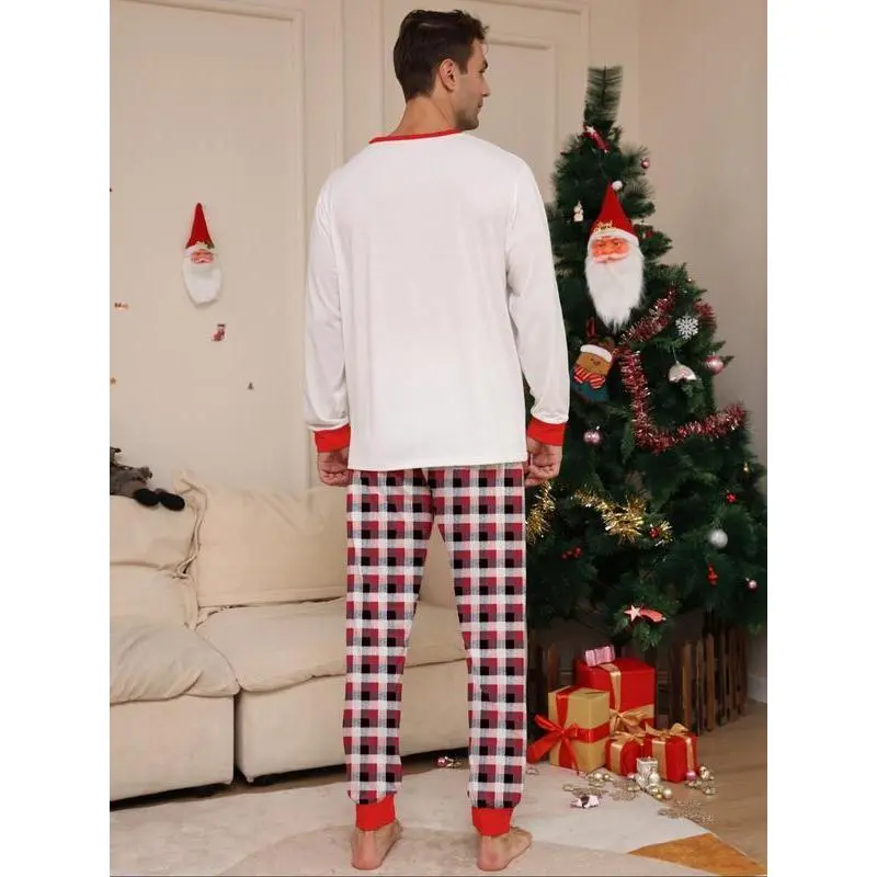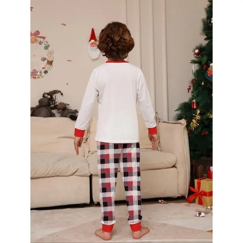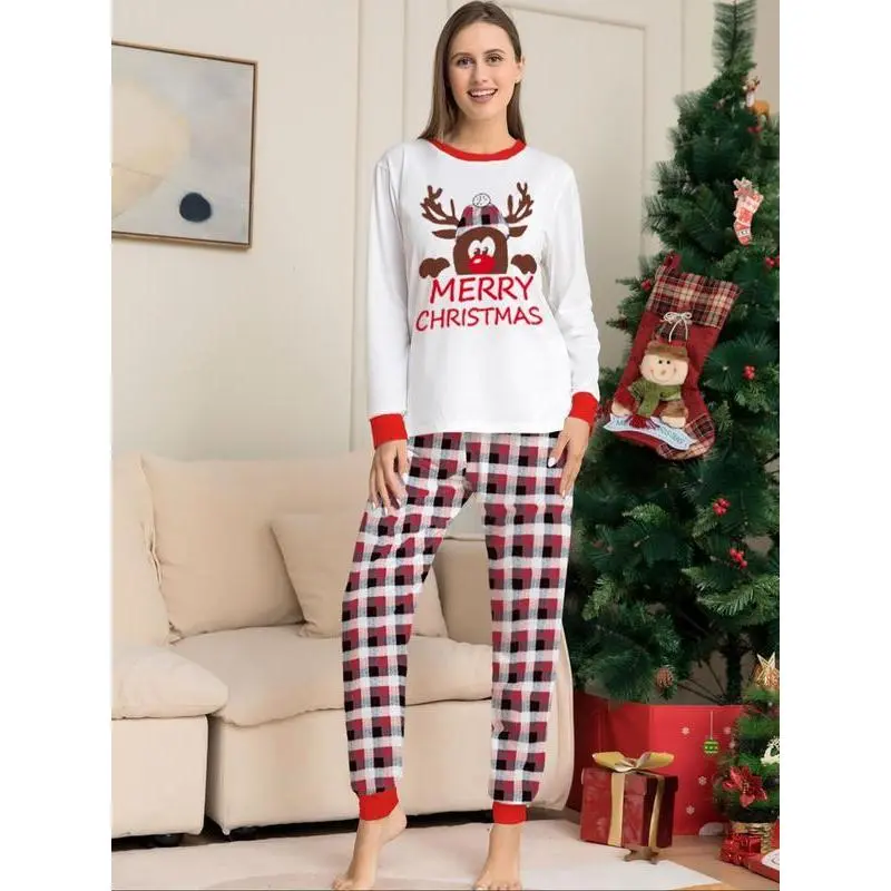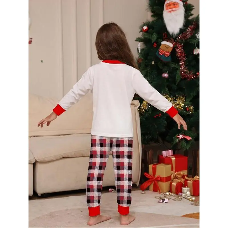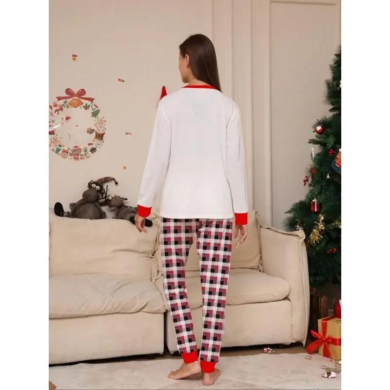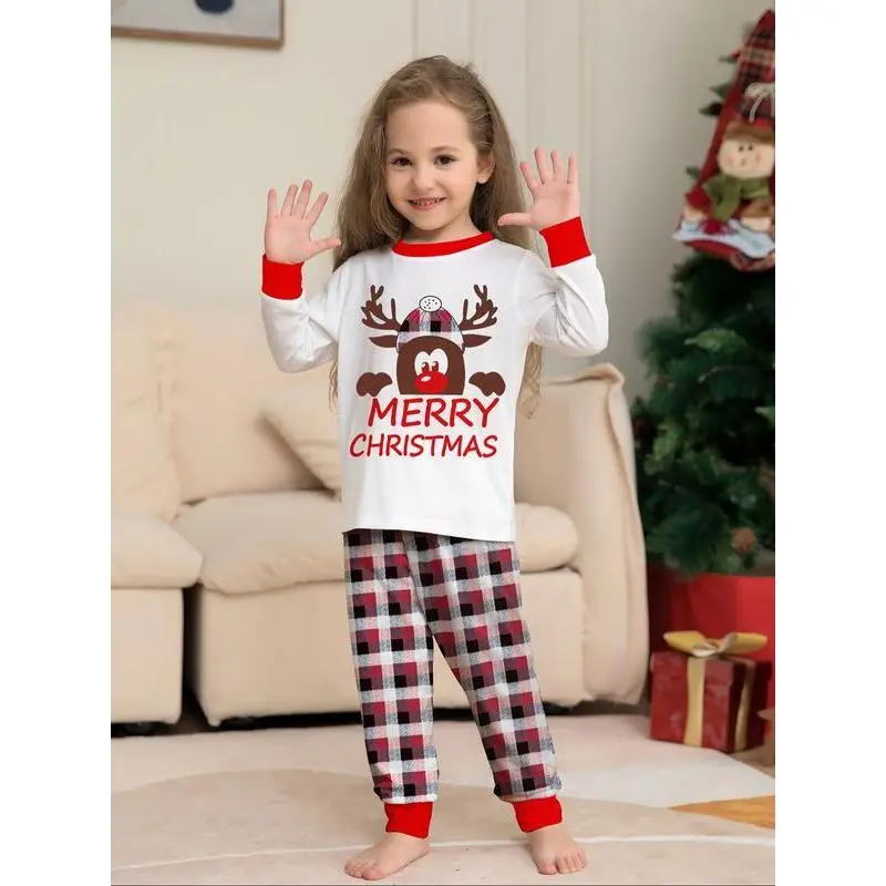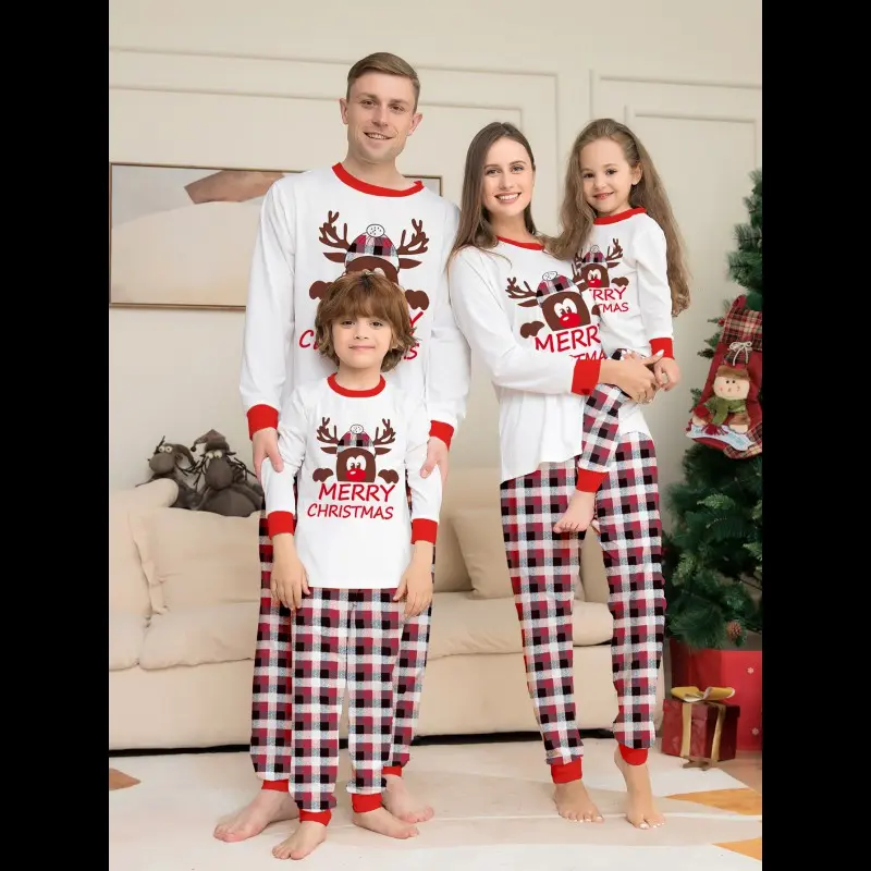 Family Christmas Pajamas Set, Cartoon Reindeer Print Top & Plaid Pants, Casual Home Wear, Fall Winter Fitted Sleepwear, 2 Piece Can be used with raincoat