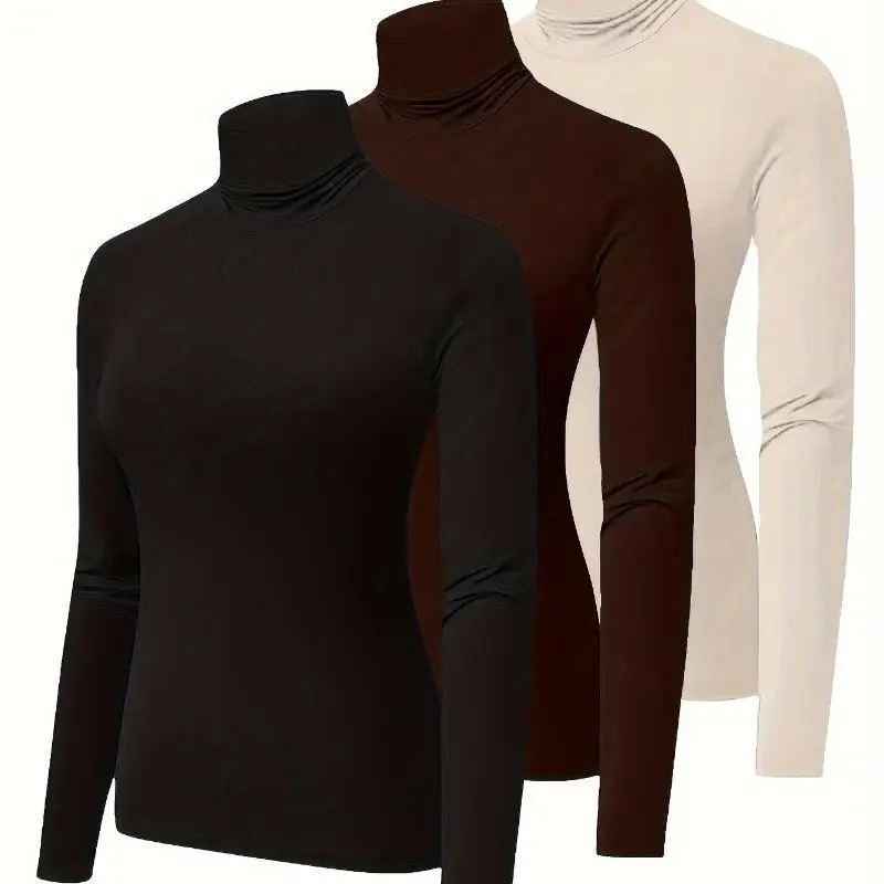 3 Pack Plus Size Women's Thermal Underwear Set: Soft, Solid Long Sleeve Turtleneck Base Layer Top 3pcs Set