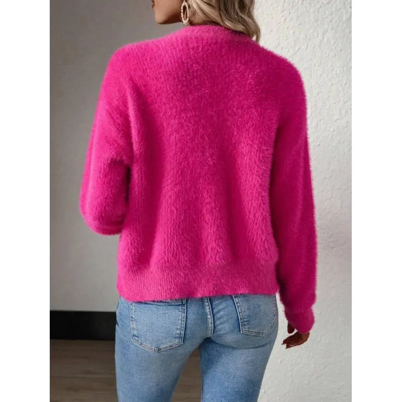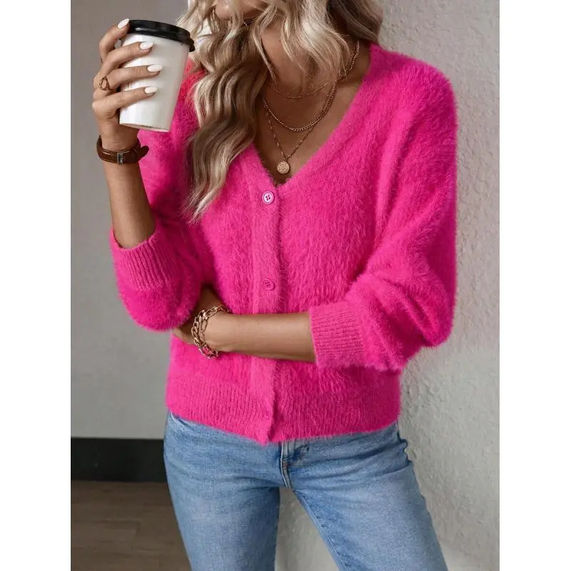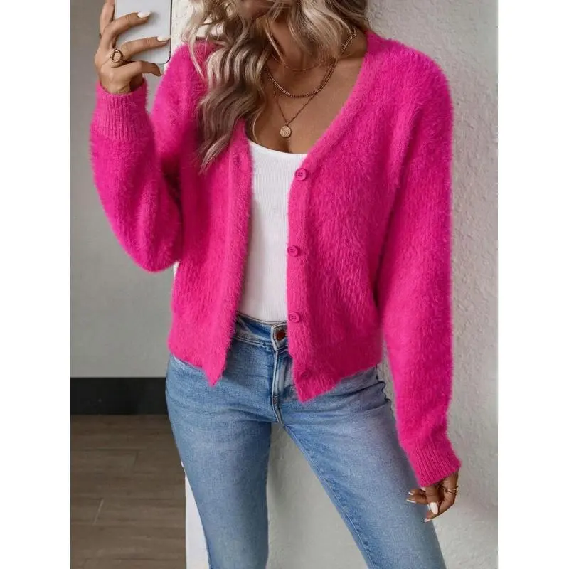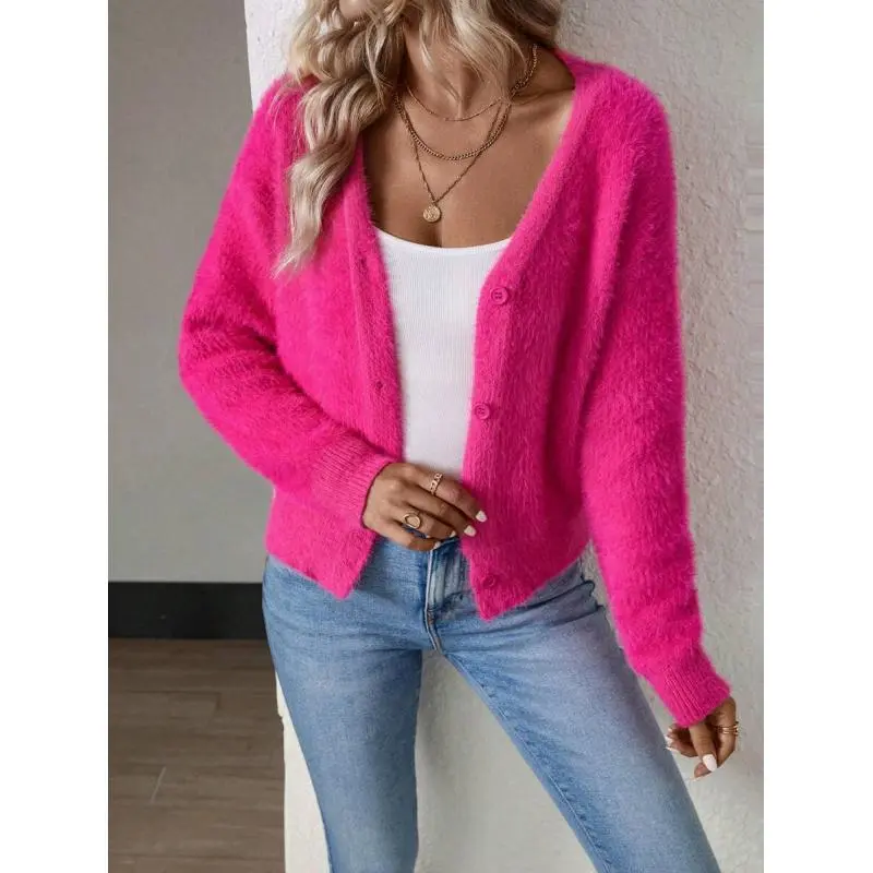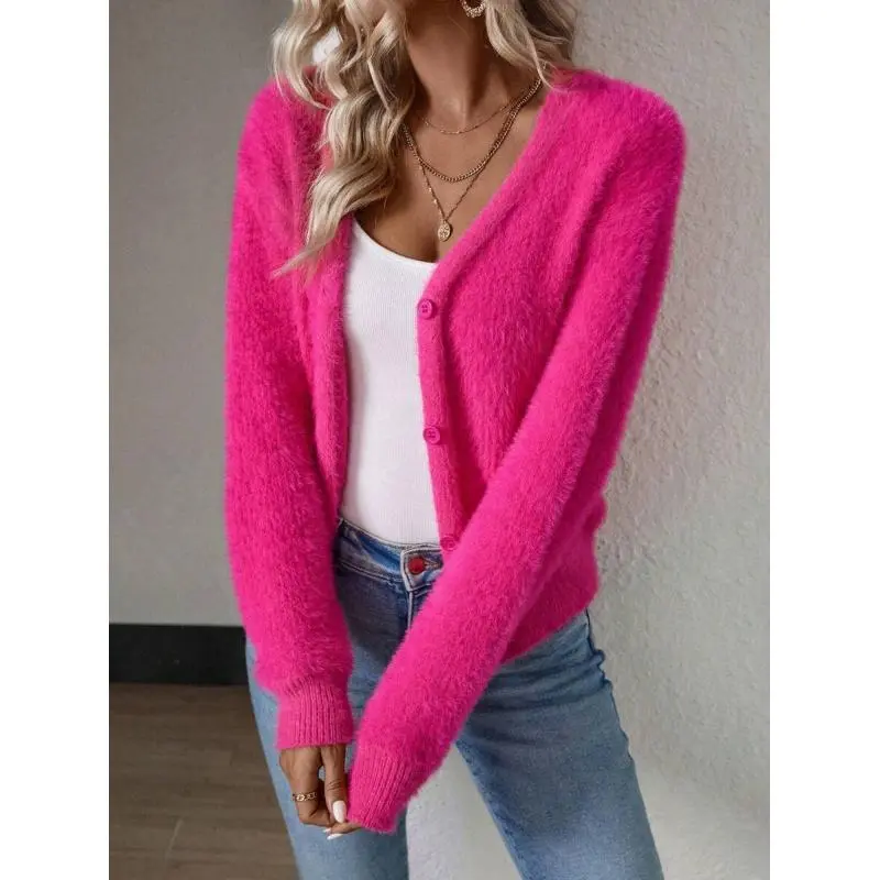 Women's Solid Color Drop Shoulder Long Sleeve Button Front Fluffy Knit Cardigan