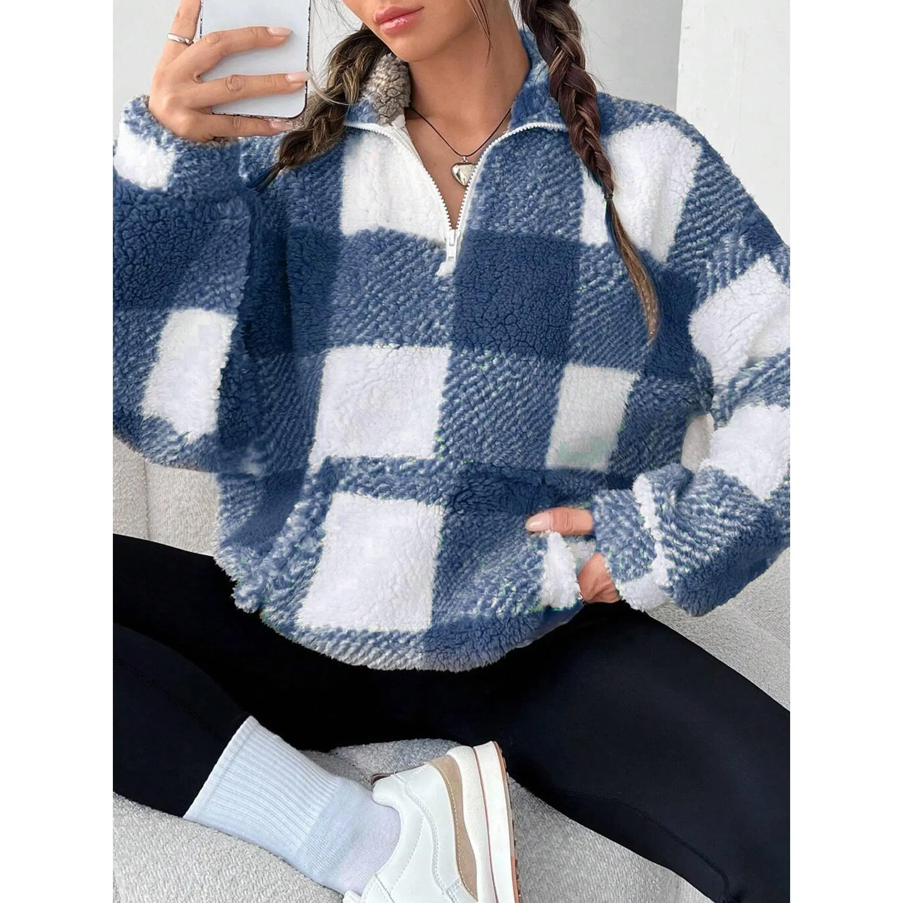 【Half-Zip Feature】: The elegant half-zip closure offers easy wear and temperature regulation, making it a suitable choice for varying weather. 【Plaid Print】: Showcasing a classic plaid print, this piece adds a timeless element to your wardrobe, perfect for both work and leisure. 【Drop Shoulder Design】: The drop shoulder style enhances a relaxed silhouette, allowing for ease of movement, ideal for day-to-day activities. 【Stand Collar】: The stand collar provides added warmth and protection against the wind, making it a practical choice for Cold days. 【Pocket Inclusion】: Equipped with a functional pocket, this sweatshirt offers a convenient solution for carrying essentials while on the go