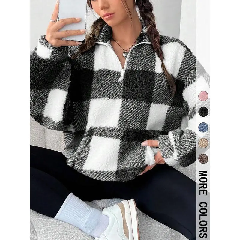 Women's Plaid Print Half Zip Drop Shoulder?Fleece?Sweatshirt, Casual Long Sleeve Stand Collar Pullover for Spring & Fall, Ladies Clothes for Daily Wear