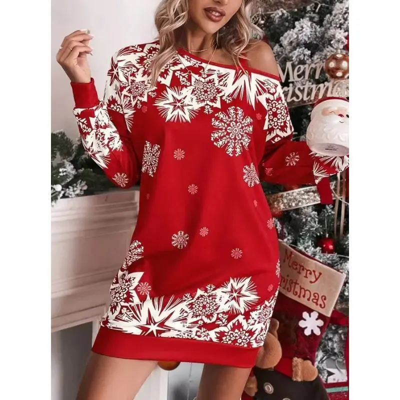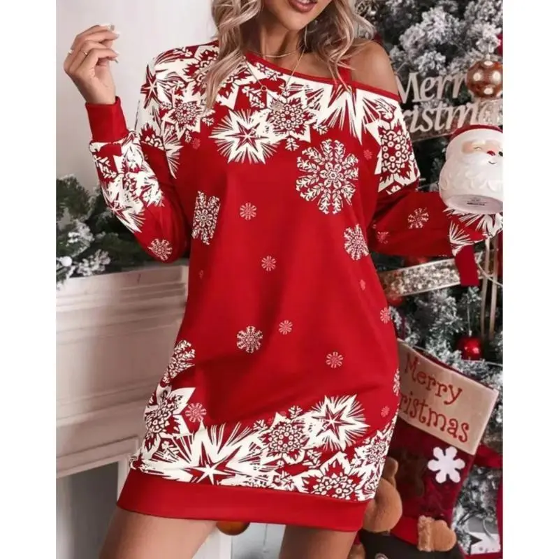 Sexy Off Shoulder Loose Pullover Dress 2024 Christmas Snowflake Print Long Sleeve Diagonal Shoulder Autumn Dress For Women Robe