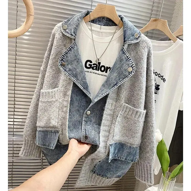 Autumn Winter Women Splicing Denim Jacket Women Long Sleeve Jean Jackets Female Loose Sweater Cardigan Jacket Fashion Leisure
