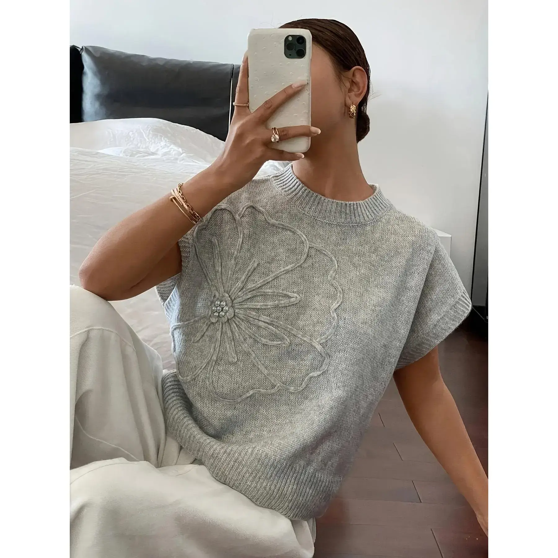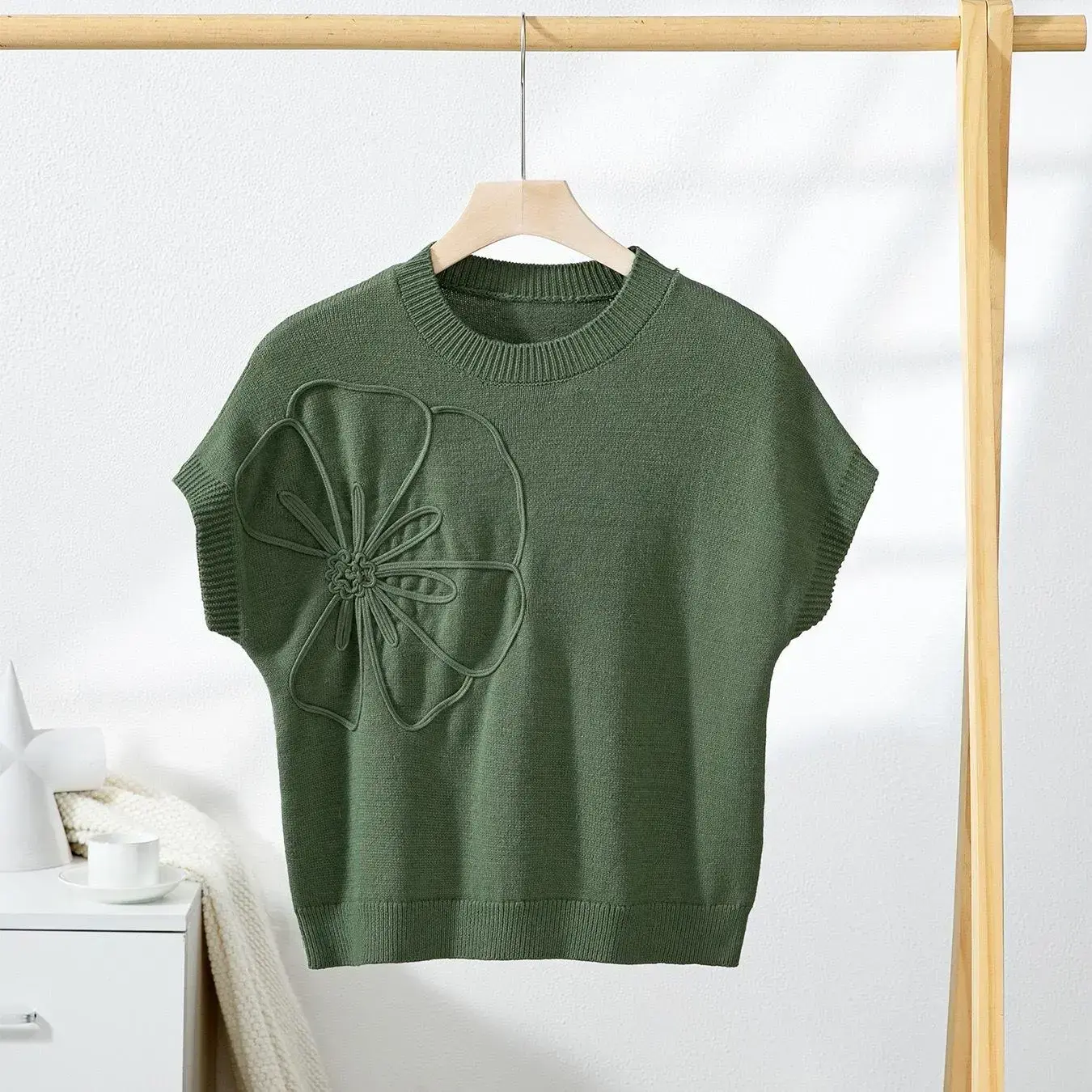 Shewin 2026 Spring/Summer Oversized Cozy Ribbed Knit Top Women’s Crew Neck Short Sleeve Pullover Elegant Solid Color Knitwear with Side Slit for All-Season Casual Outfits