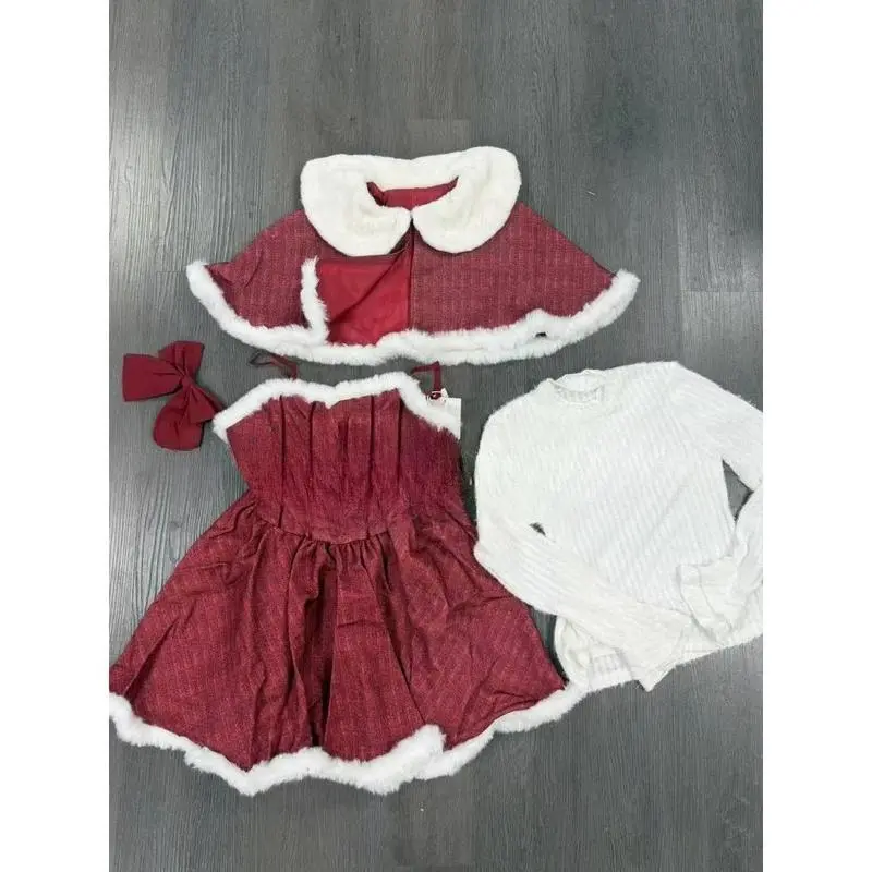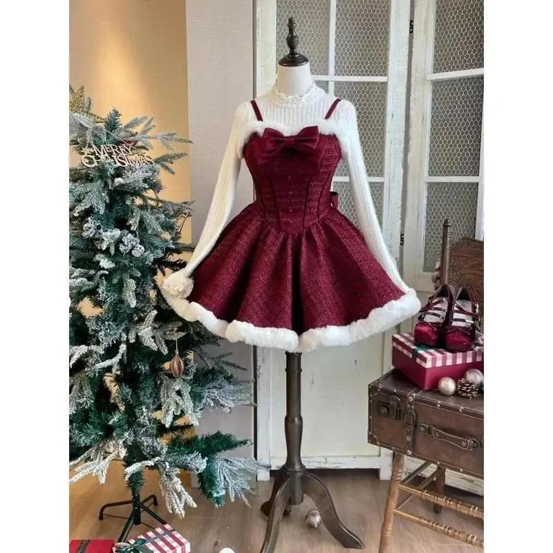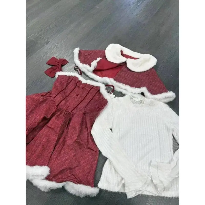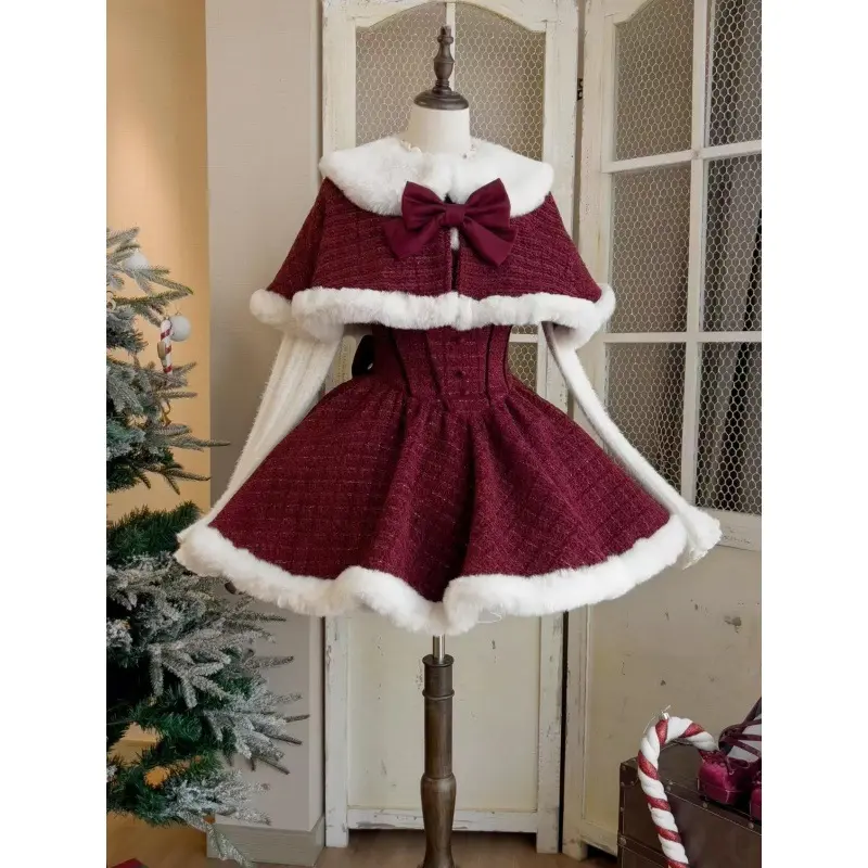 Christmas Red Vintage Suits Women Casual Cloak Coast + Sleeveless Mini Dress Faux Fur 3 Piece Dress Sets Evening Party Outfits