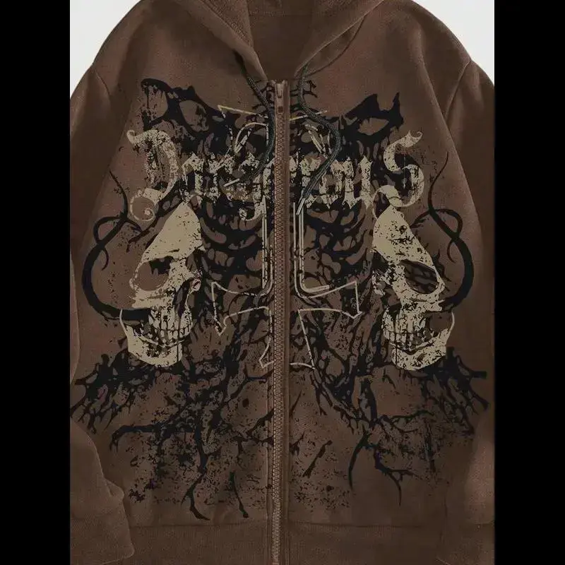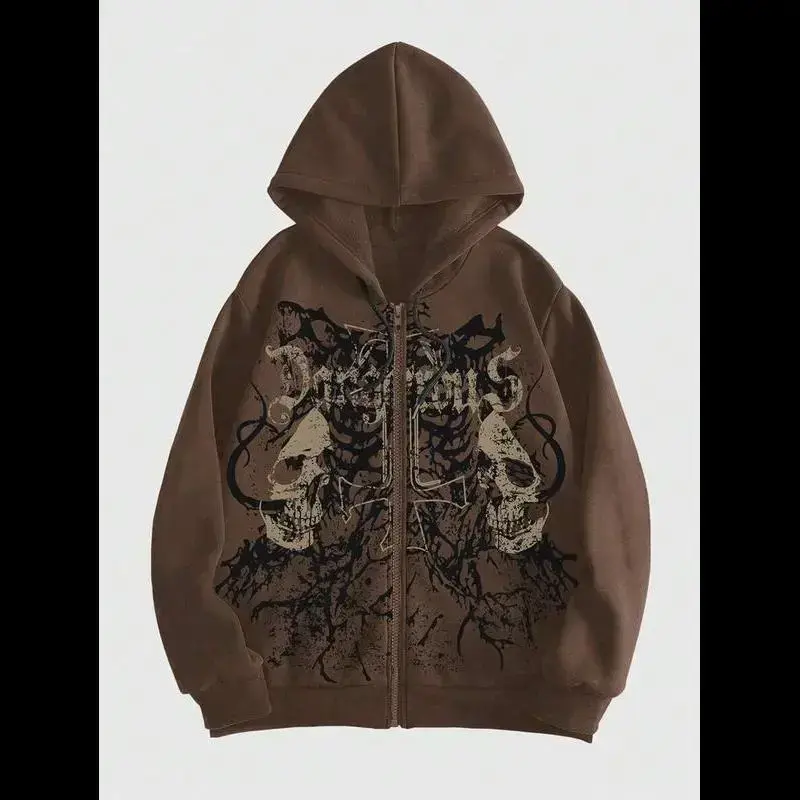 MEN Grunge Punk Men's Skull Letter Print Zipper Closure Hoodie, Long Sleeve, School Casual Brown