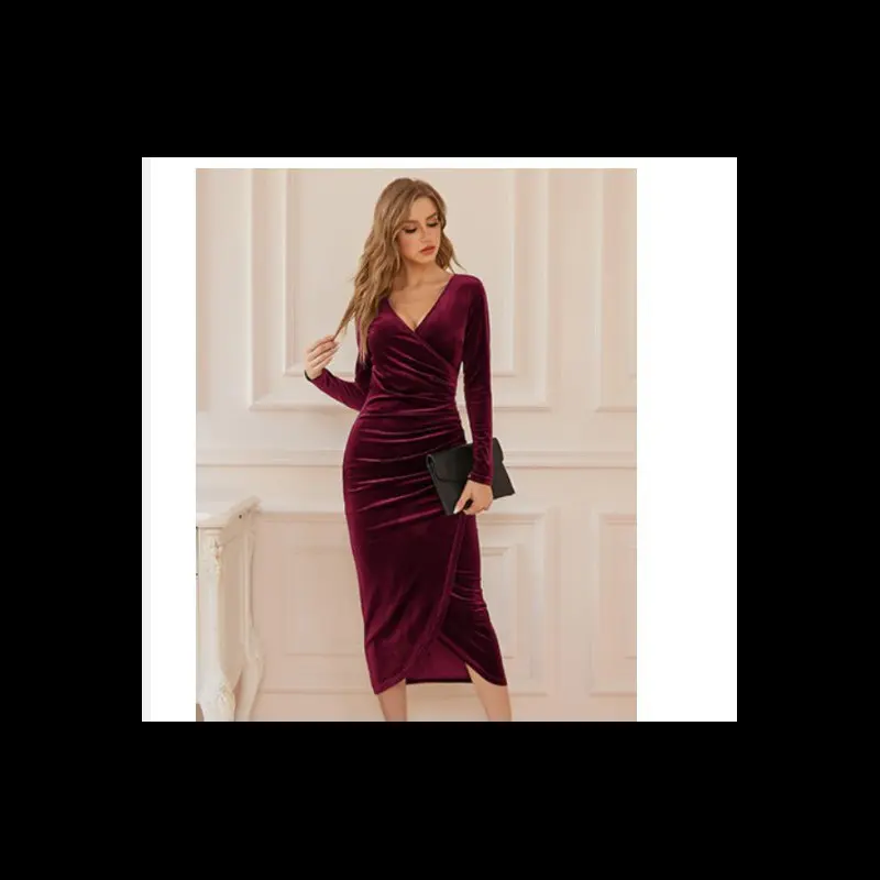 Fall Winter Womens V Neck Asymmetrical Midi Dress Emerald Green Velvet Wrap Design Long Sleeve Bodycon Fit Irregular Hem Ideal for Date Nights Holiday Dinner Parties Chic Formal Wear Can be used with a raincoat
