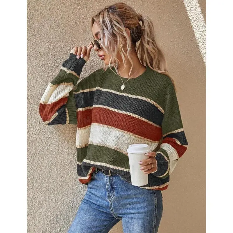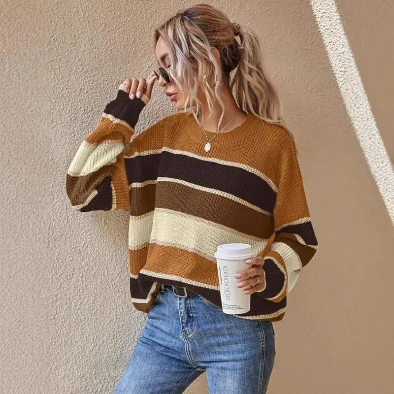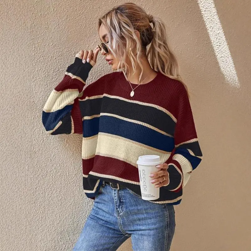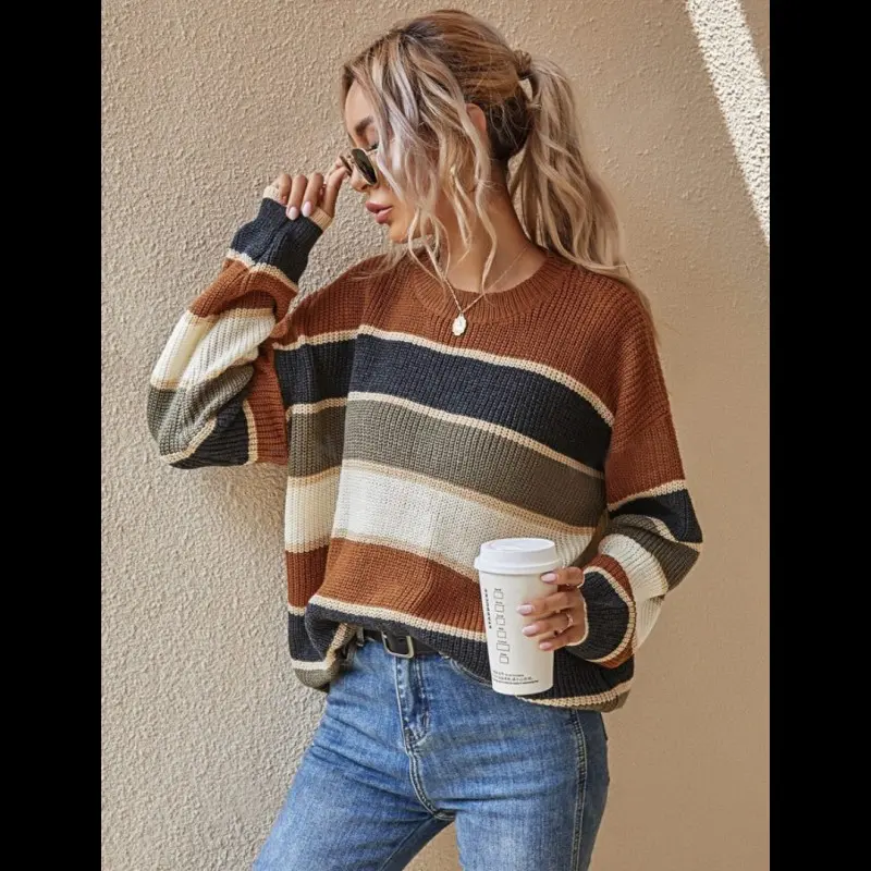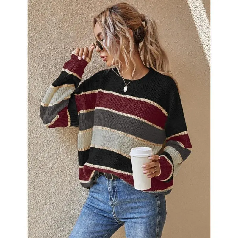 Women's Colorblock Striped Print Drop Shoulder Sweater - Casual Round Neck Jumper for Fall & Winter | Daily Wear Knitwear Fabric Soft