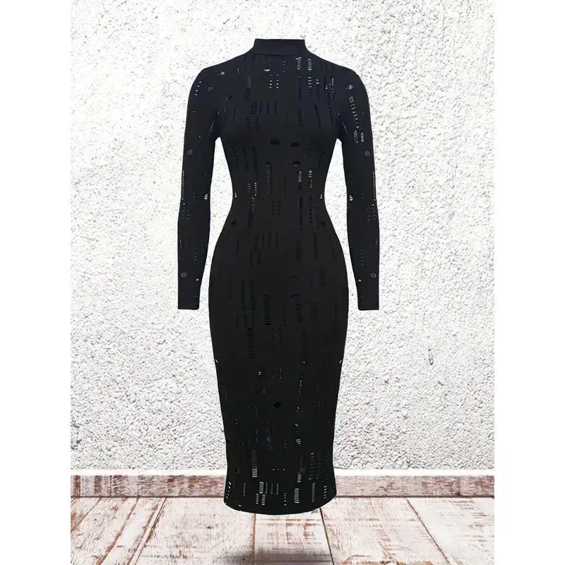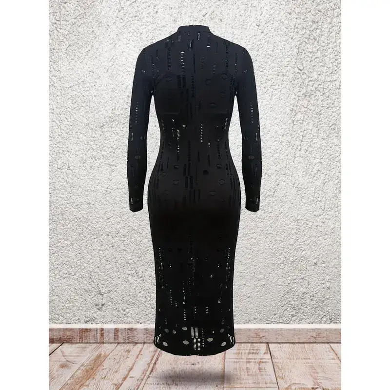 Elegant WOMEN'S sheer cut-out long sleeve bodycon dress set-high neck stretch polyester blend machine washable Fabric Spandex Collar Formal Black Chic