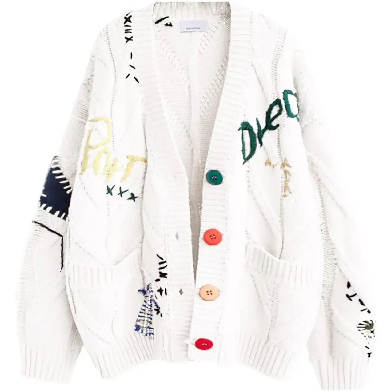 Womens Open Front Cardigan Cable Knit Long Sleeve Button Down Embroidery Cardigan Sweaters