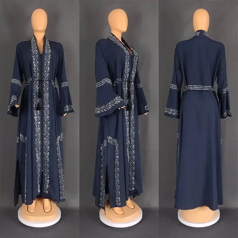 This Muslim robe perfectly combines the traditional charm of Arab Abayas with modern fashion design, and is a synonym for elegance and dignity. It is made of light and breathable chiffon fabric, which is soft and smooth in texture, comfortable and comfortable to wear, and can keep you cool even in hot weather. ? The robe adopts a classic loose fit, ingeniously shaping the figure while adhering to the traditions of Muslim clothing. The most distinctive long-sleeved horn design naturally hangs down from the shoulder and gradually spreads out, flowing gracefully and nimbly as one moves, adding a romantic touch. The cuffs are adorned with exquisite embroidery or trim details, highlighting quality and craftsmanship. The garment is simple and elegant, with subtle patterns faintly visible in the solid color tone, exuding a high-end texture in a low-key manner. Whether attending religious ceremonies, strolling through Arab markets, or going out on a daily trip, wearing a headscarf in the same color and simple accessories can easily showcase the unique charm of a Muslim woman's gentle and elegant demeanor.