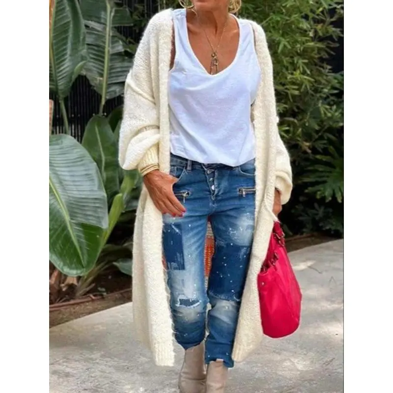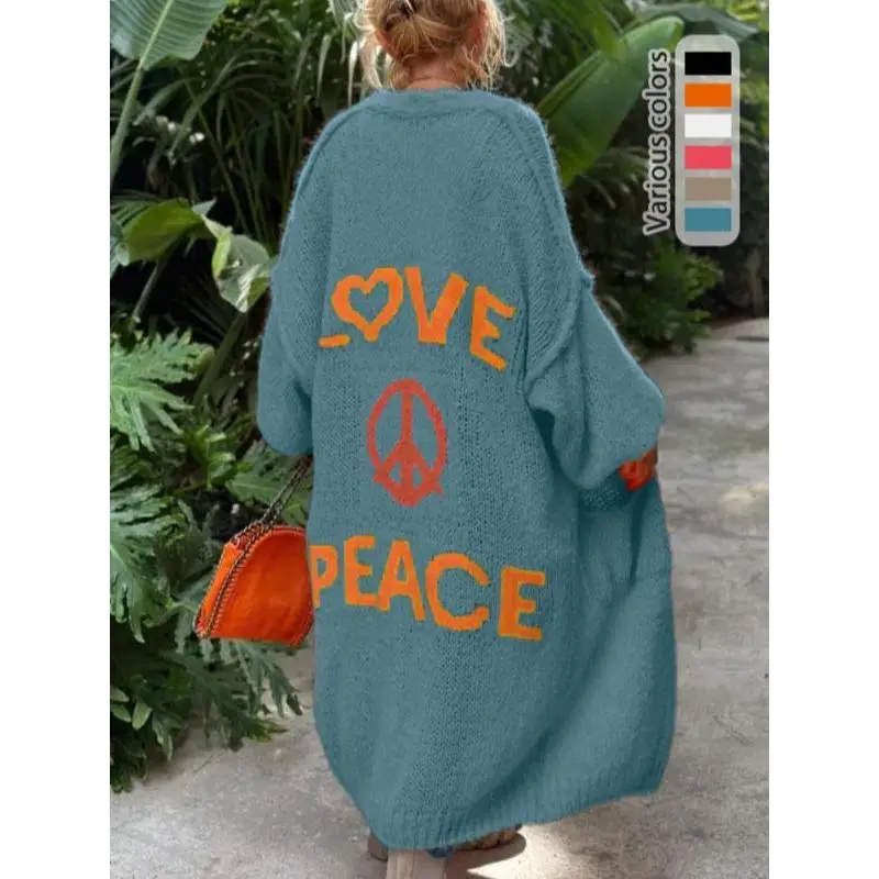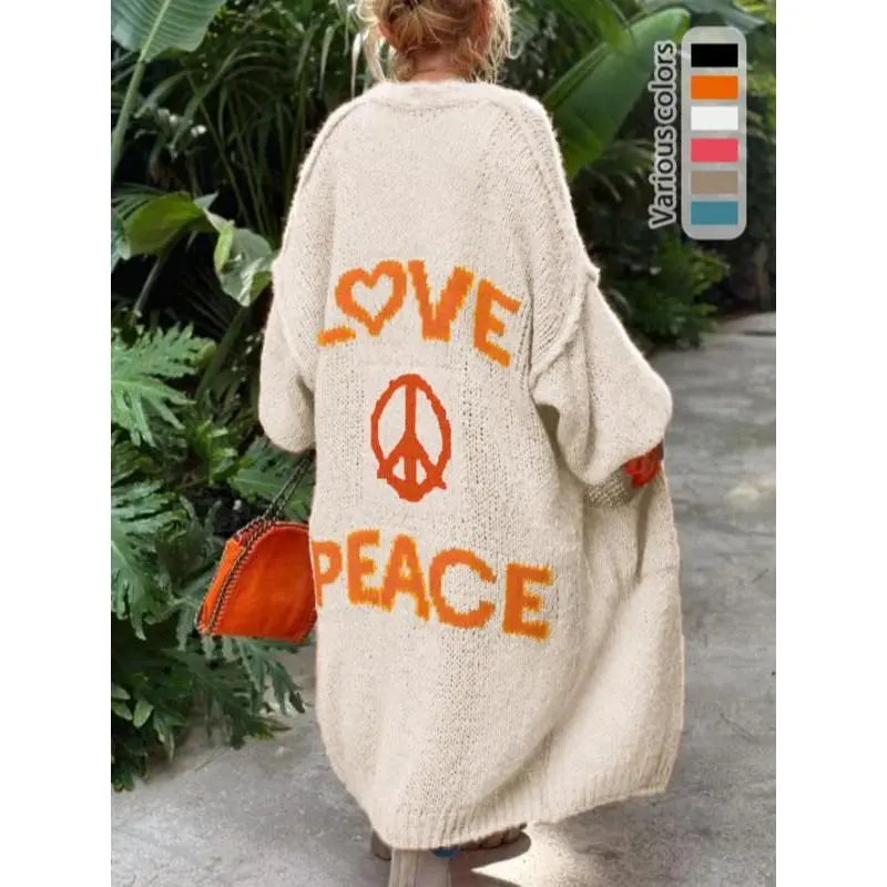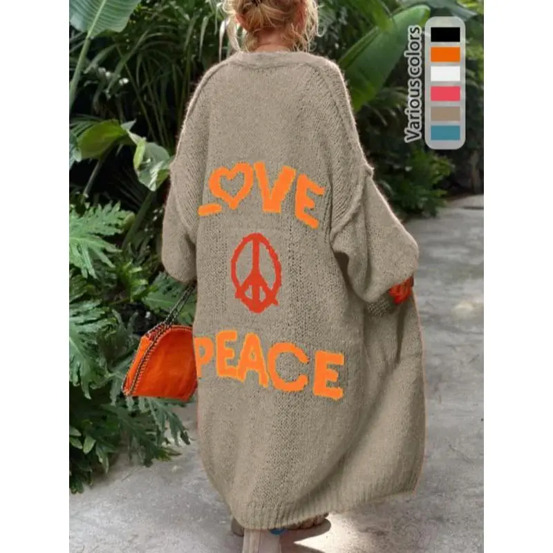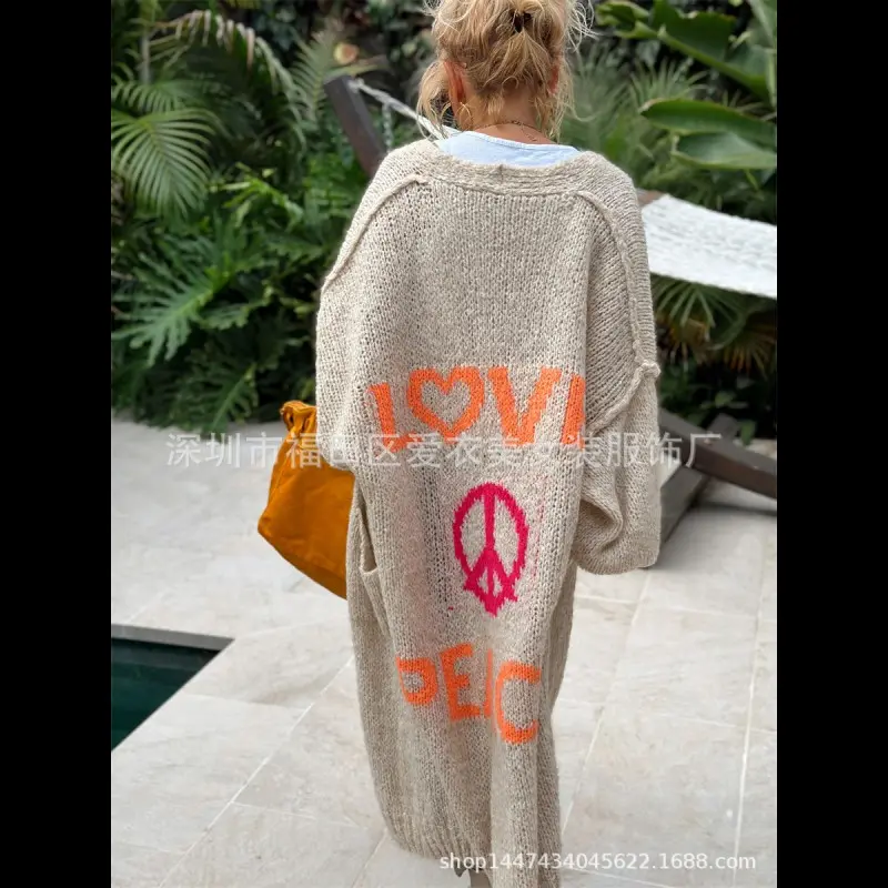 ??LengthyCoverage??:Thelongdesignoffersadequatecoverage,providingwarmthandprotectionduringcoolermonths. ??ModerateThickness??:Craftedwithamoderatefabricthickness,itissuitableforbothspringandfallseasons. ??LooseFit??:Theloose-fittingsilhouetteallowsforunrestrictedmovement,makingitcomfortablefordailywear. ??KnittedFabric??:Madefromqualityknitfabric,itensuresdurabilityandapleasanttextureagainsttheskin. ??LetterPrint??:Featuresadistinctiveletterprintthatenhancesvisualappeal,settingitapartfromtypicalcardigans.
