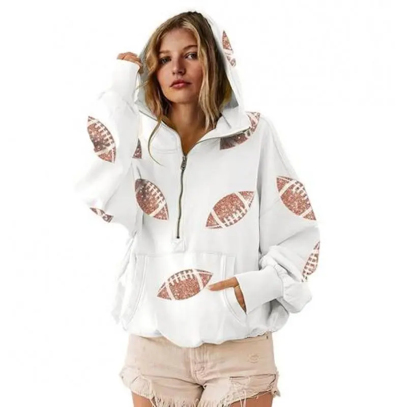 Women's Football Sequin Hoodie Half Zip Long Sleeve Rugby Patch Game Day Hooded Sweatshirt Comfort Soft Fabric Daily Wear Sports Events Outings Fall Winter Style Lounge Wear Stylish Ladies Womenswear