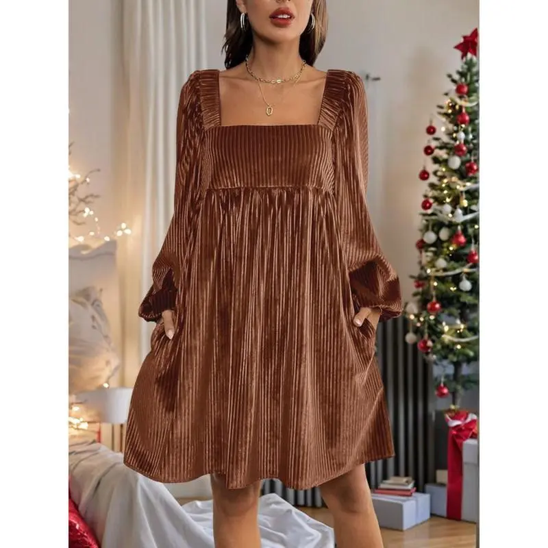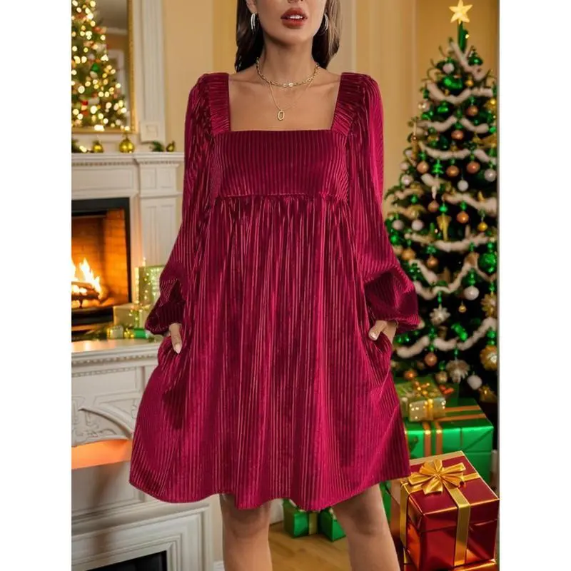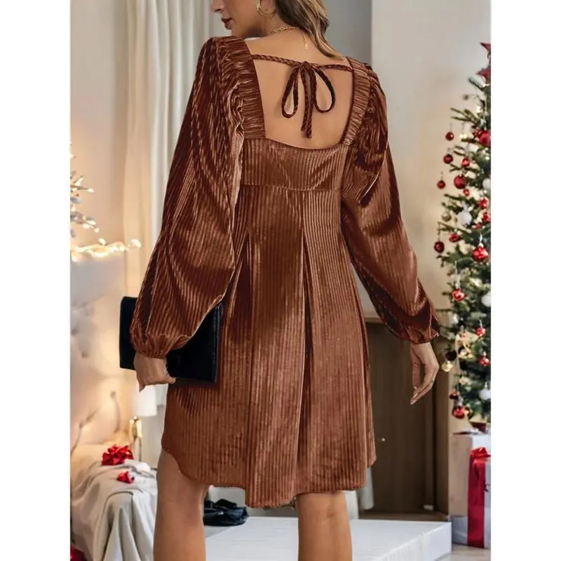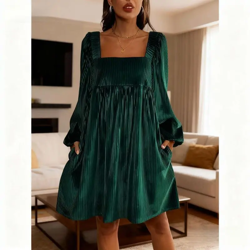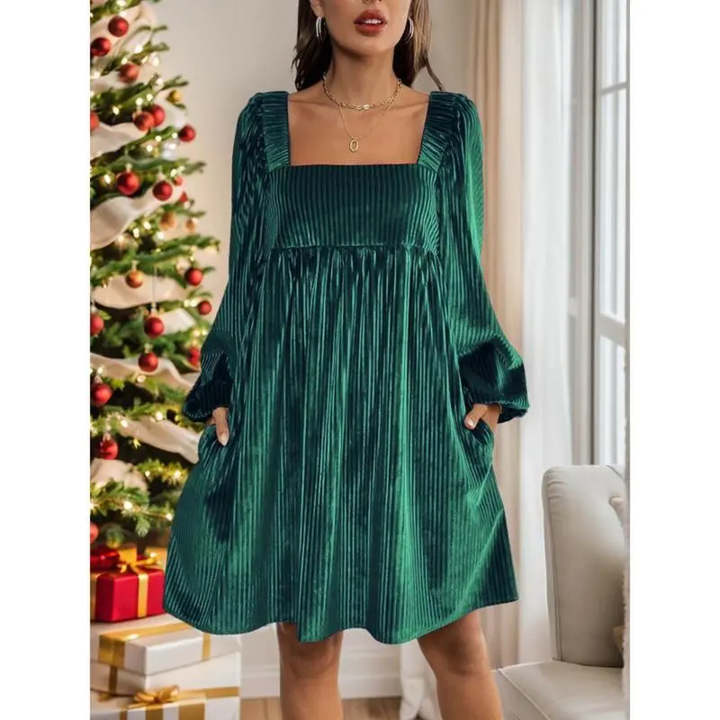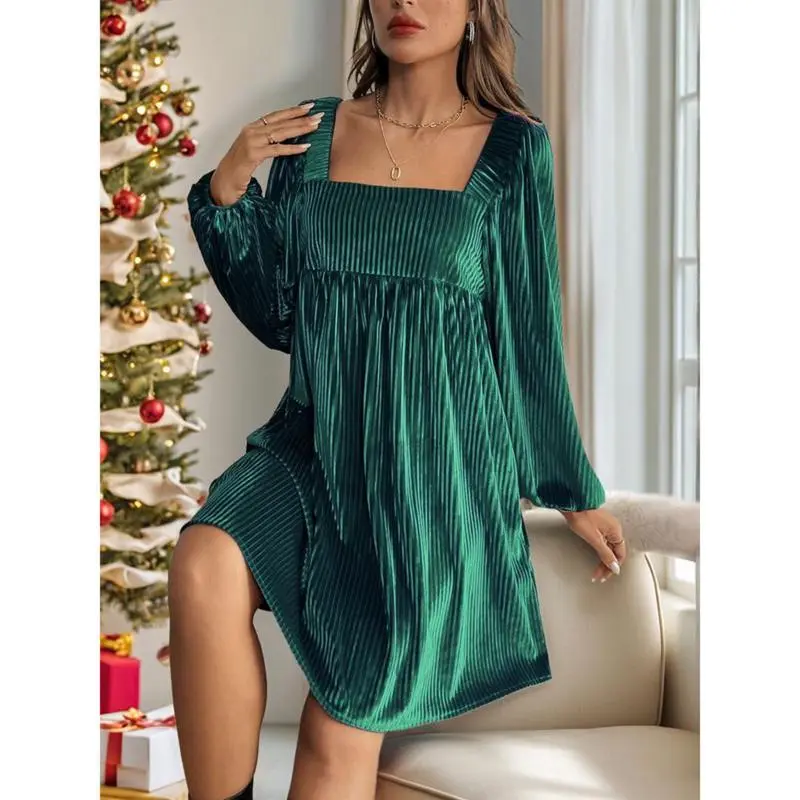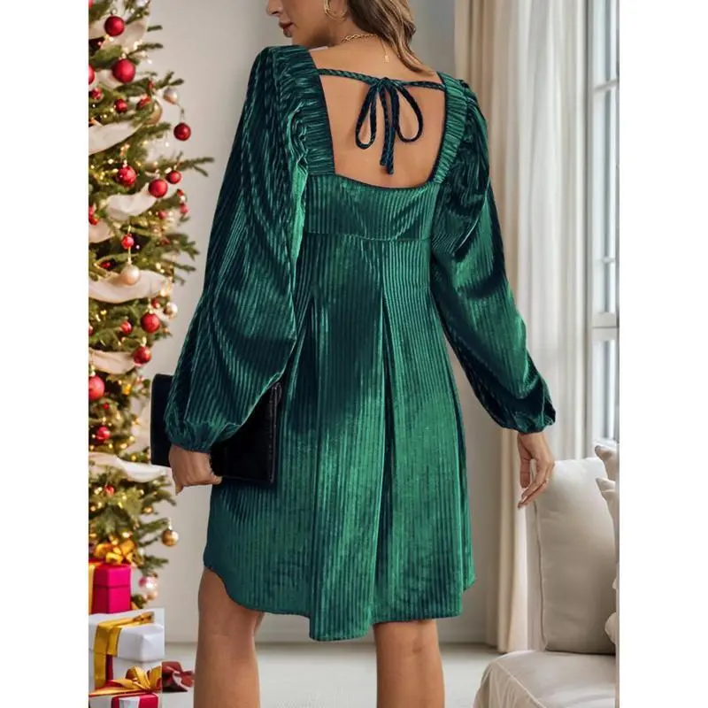 Women's Christmas Dress Elegant Fitted Backless Square Neckline Velvet for Daily Wear Spring and Fall Casual Adjustable Dark Green Bishop Sleeves Minimalist Basic Formal