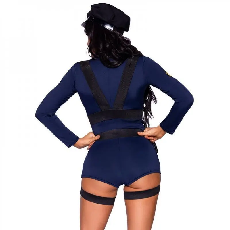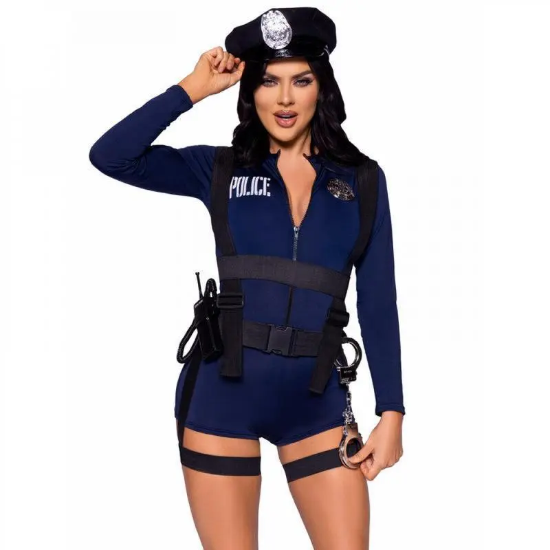 Protect and serve up smoking hot looks in the Handcuff Hottie Cop costume by Leg Avenue.This 6 piece sexy Halloween costume for women features a curve-hugging zipper front romper, pin-on badge, garter body harness, toy walkie talkie, and matching police hat.This easy Halloween costume doubles as a role play costume for some naughty bedroom fun. Package Includes: romper, badge, body harness, toy walkie talkie,, police hat Fit & Style: Everyone loves a lady in uniform, especially in this curve-hugging zipper front bodysuit with cheeky shorts. Occasion: Cop costumes are classic sexy Halloween costumes and are extra fun as costume role play. Features: The soft stretchy fabric of this police costume keeps you comfortable and cozy while you're on the job. Complete the Look: Pair with thigh highs or socks for a look that’s means business. Materials/Care: Hand wash cold, Do not bleach, Drip dry, Do not iron Model is 5'8" and is a dress size 2