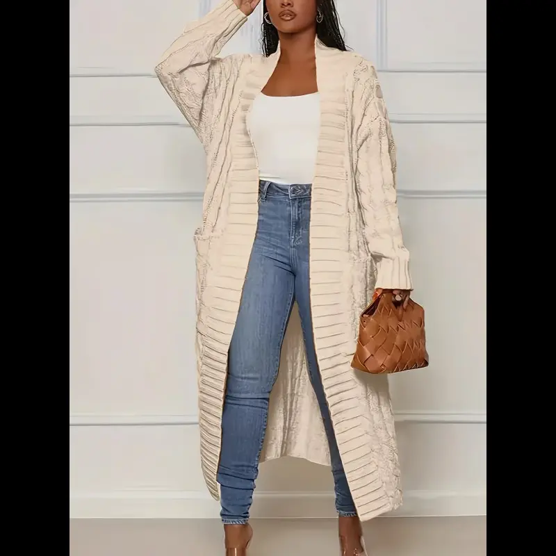 Women's Solid Color Textured Drop Shoulder Pocket Longline Cardigan Casual Open Front Long Sleeve Knitwear Comfy Warm Fabric Baggy Fit For Fall Winter Daily Wear Outings Office Layered Outfits Womenswear