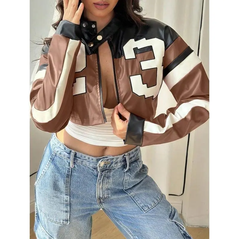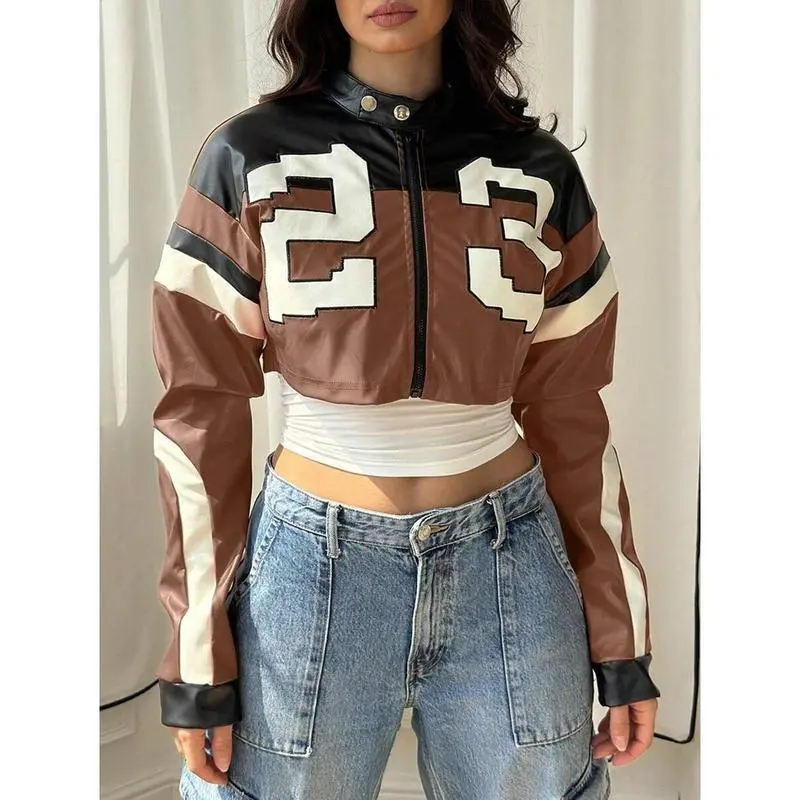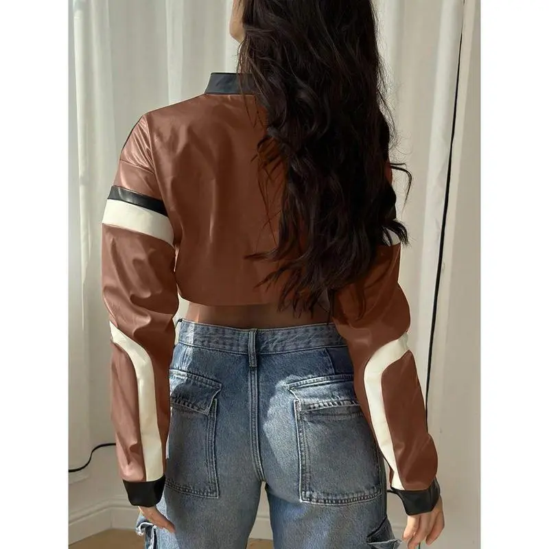 Material: Polyester.The material of this leather jacket is comfortable and soft./Features: Leather biker jacket,cropped jacket,bomber jacket,racer jacket,motorcycle jacket women,lightweight jacket women,zipper closure,long sleeves,with lining,color contrast,street style./Occasions: Casual, club, daily wear, shopping, party, dinner, dating, weekend, night out, biking, motorcycle, exercise, work, decoration day etc./Matching: Good match with jeans, pants, skirts, shirts, shorts, tank top, camisole, etc for a stylish look.It is suitable for the spring, summer,autumn./Neckline:Stand Collar/Occasion:Night Out, Holiday, Daily, Birthday Party/Sleeve Type:Regular Sleeve/Hem Shaped:Regular/Festivals:Independence Day/Lined For Added Warmth:No/Pattern Type:Colorblock/Style:Casual/Body:Unlined/Placket:Zipper/Details:Zipper/Pockets:No/Features:Great quality/Type:Bomber/Color:Brown/Sleeve length: long sleeve/Length:Short/Fit Type:Regular Fit/Fabric Elasticity:Non-Stretch/Material:Woven Fabric/Composition:100% Polyester/Care Instructions:Machine wash or professional dry clean/Belt:No/Sheer:No/variety jacket