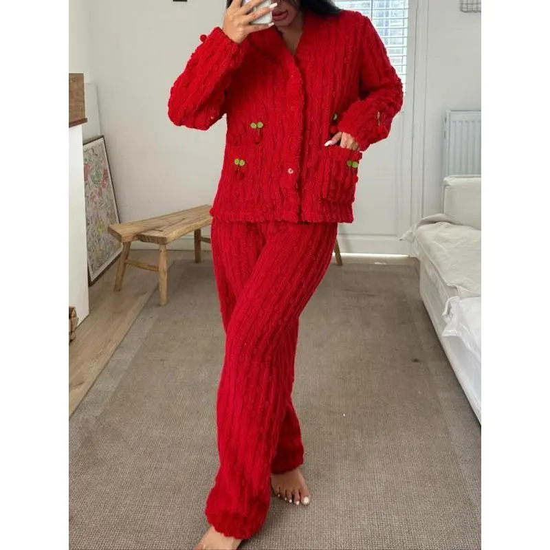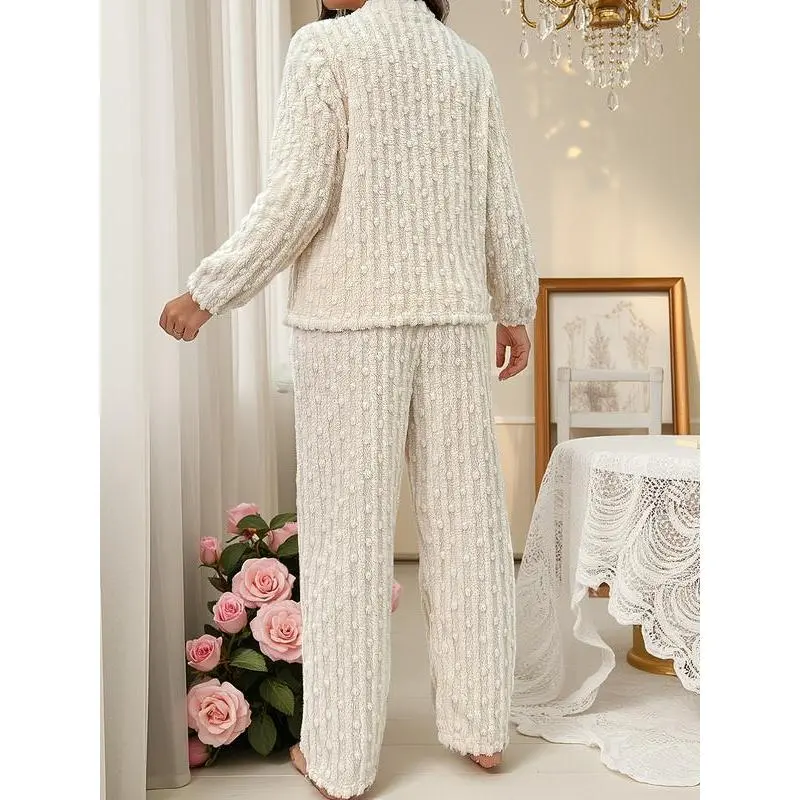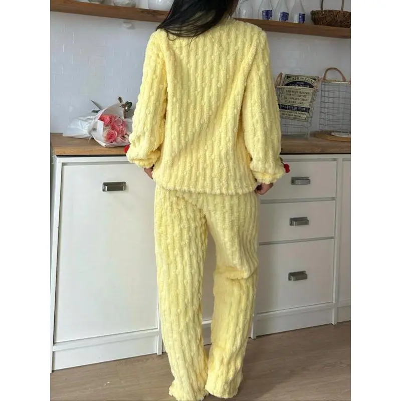 ??Thickened Warmth??: This winter sleepwear features an added layer for enhanced warmth during chilly days at home. ??Two-Piece Set??: The outfit includes a long-sleeve top and long pants, providing a cohesive look for home wear. ??Convenient Pockets??: Equipped with pockets, this sleepwear allows for easy storage of essential items without compromising aesthetics. ??Loose-Fitting Cut??: The loose-fitting cut offers freedom of movement, ensuring an unrestricted experience while lounging. ??Charming Pattern??: The plain pattern exudes a simple charm, providing a classic aesthetic that is both understated and graceful.