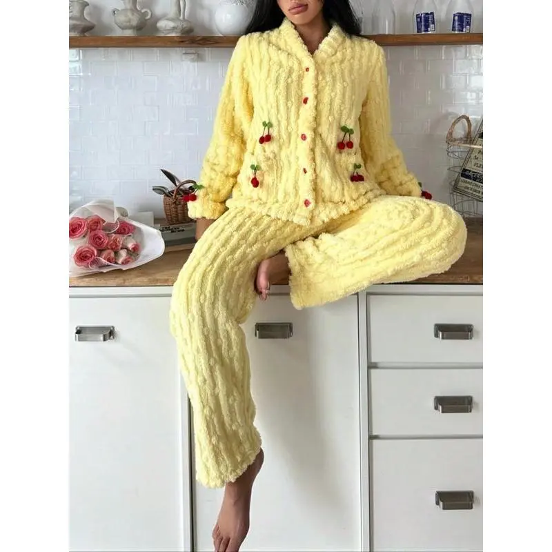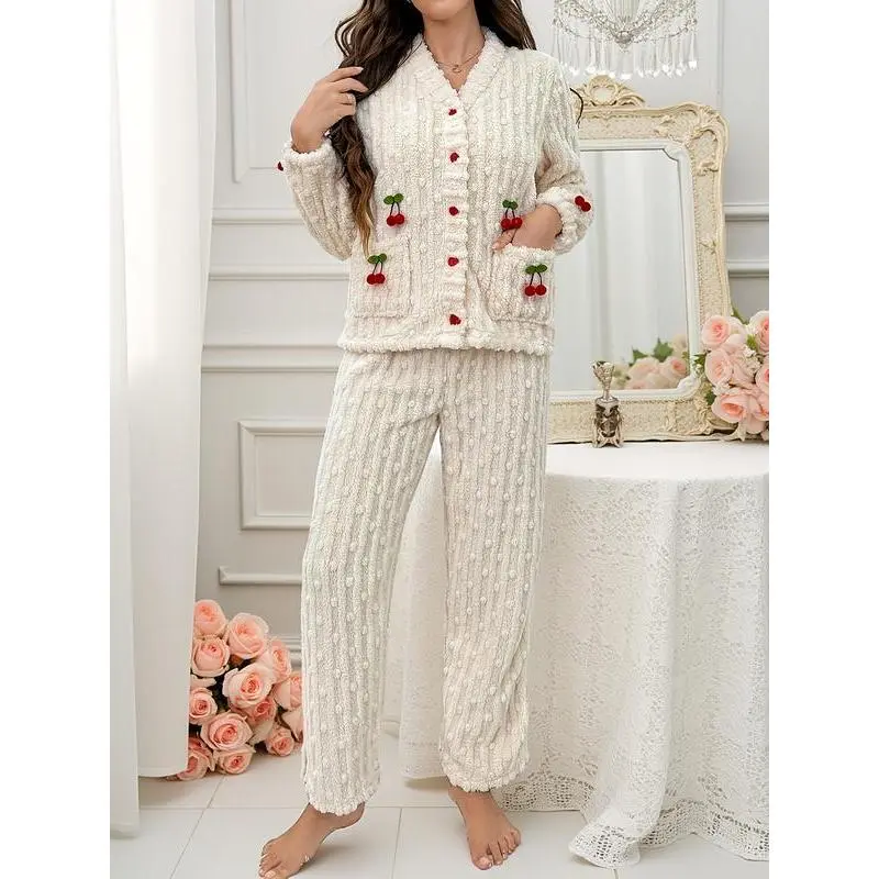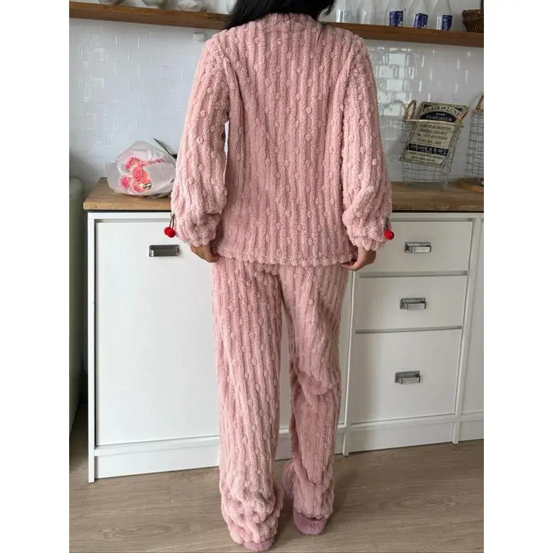 Women's Flannel Pajama Set, Sweet Style Winter Warm Home Wear, Long Sleeve Top & Pants with Pockets, Thickened Fabric for Fall & Winter Can be used with raincoat