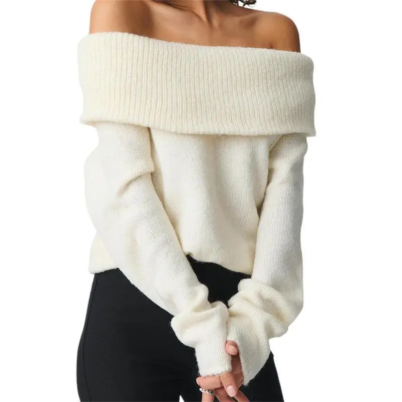 Women's Off Shoulder Crop Sweater Solid Color Boat Neck Long Sleeve Loose Knitwear Pullover Womenswear Polyester Knitting Top Can be used with raincoat