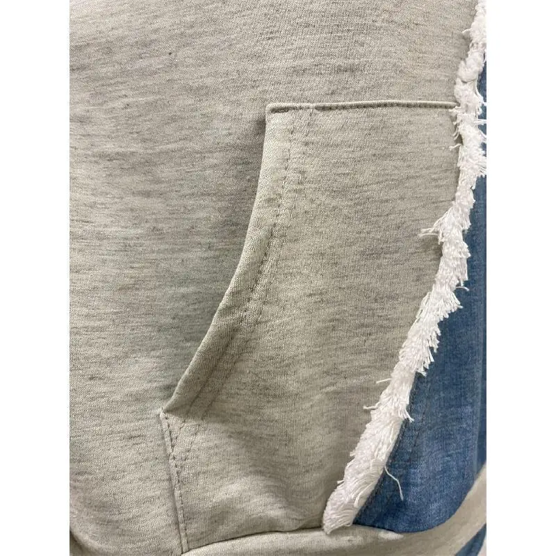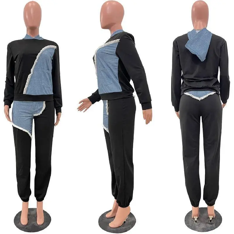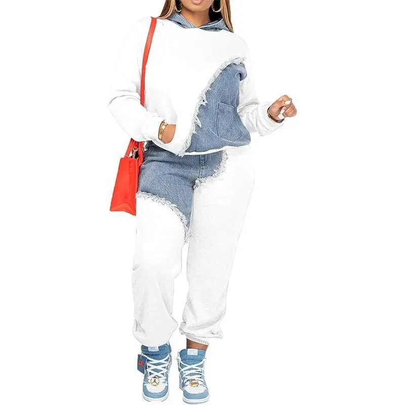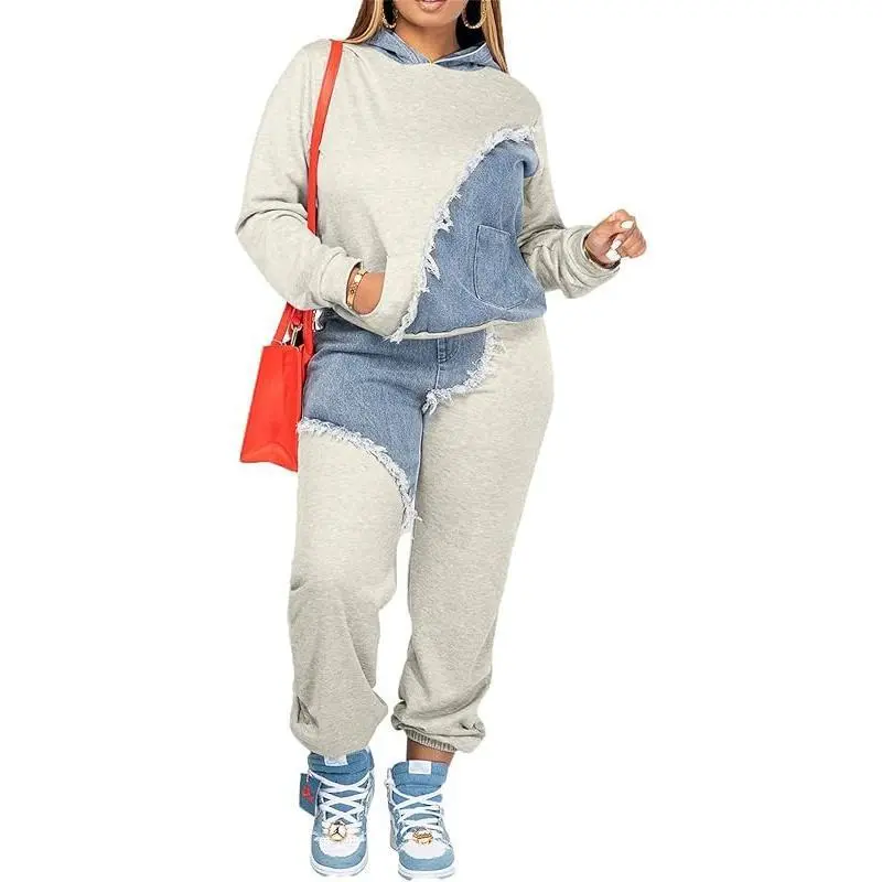 Women's Long Sleeve Casual Hooded Sweatshirt + Pants Two-Piece Set with Pockets Patchwork Denim Tracksuit Can be used with a raincoat