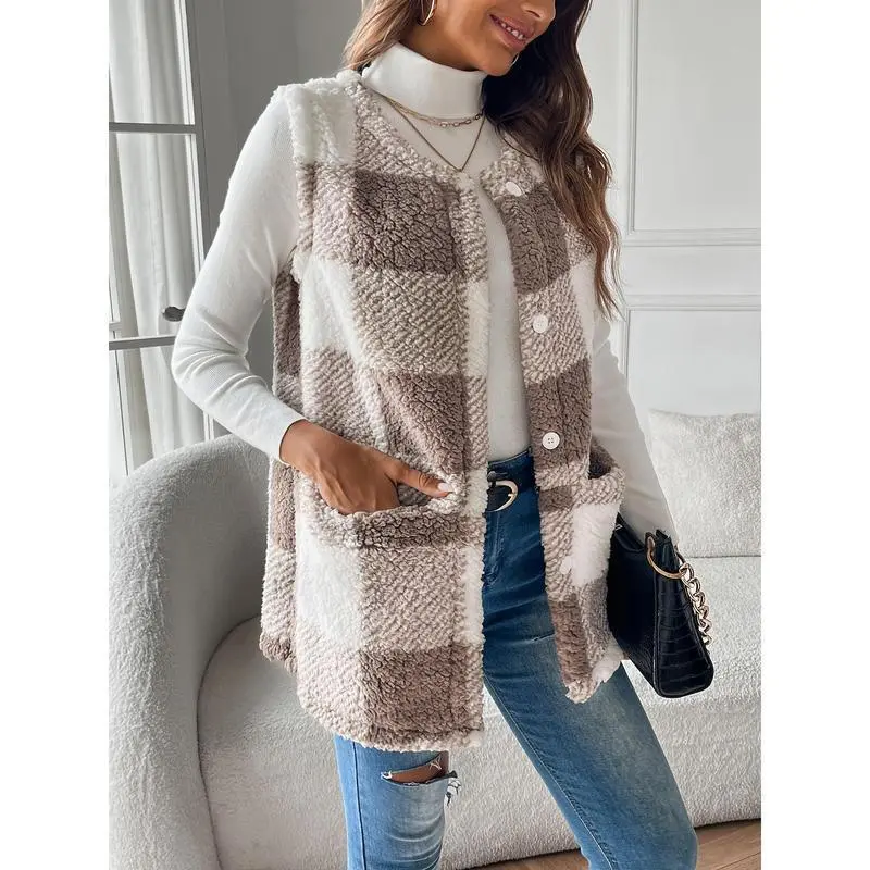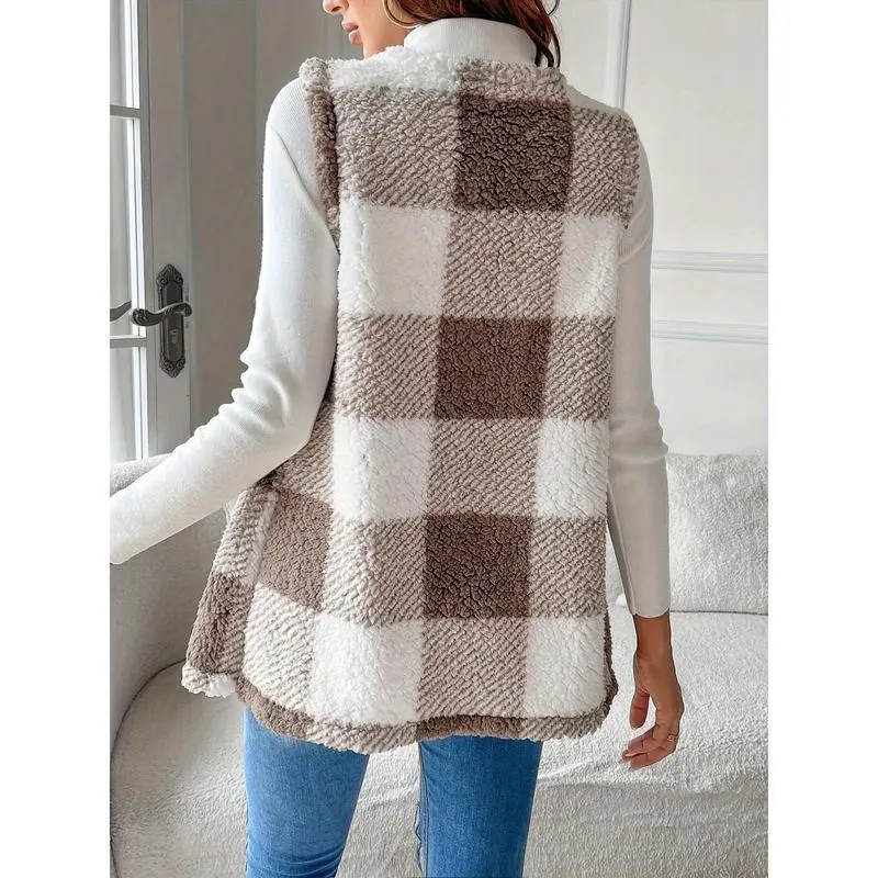 Cozy Plaid Teddy Vest - Women's Casual Sleeveless Winter Vest with Pocket and Soft Fleece Lining - Perfect for Outdoor Activities and Daily Wear Collar Fabric Knit Womenswear Cardigan Polyester Tops Comfort Crewneck