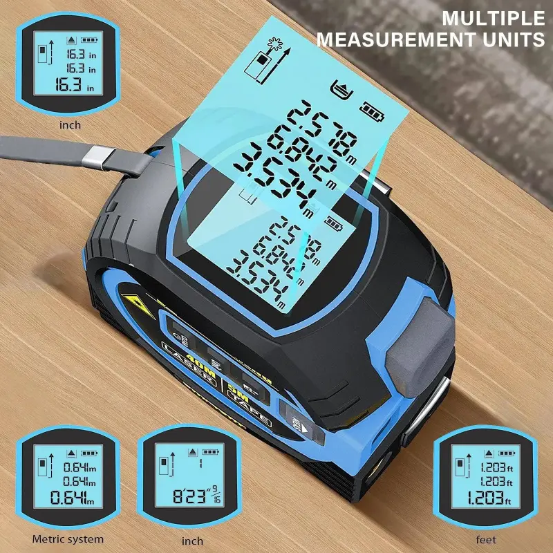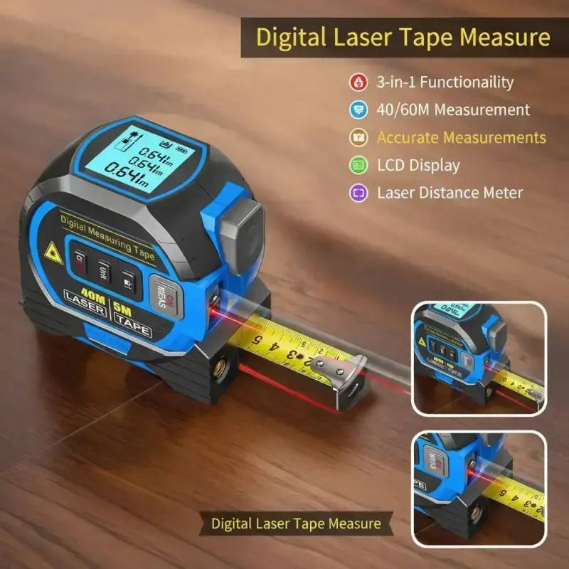 3 in 1 Digital Laser Tape Measure, 40/60M Measuring Range Laser Distance Meter, Accurate Measuring Tool with LCD Display, Laser Range Finder