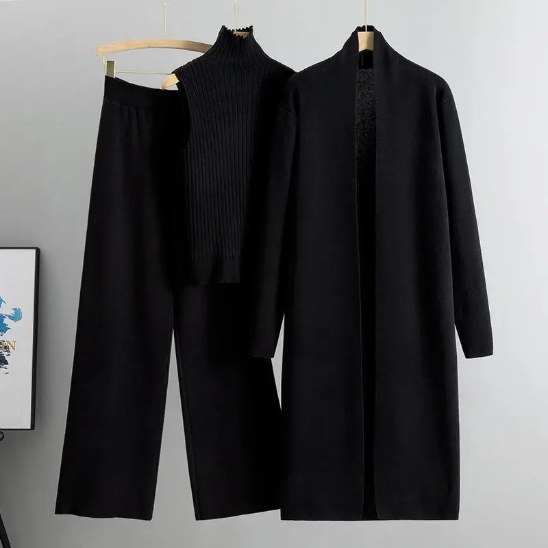 Three-Piece Set Women's Solid Turtle Neck TankTop & Wide Leg Pants & Open Front LongCardigan Set, Casual Fashion Cozy Three-pieceOutfits for Daily Outdoor Wear, Women Clothesfor Fall & WinterGift